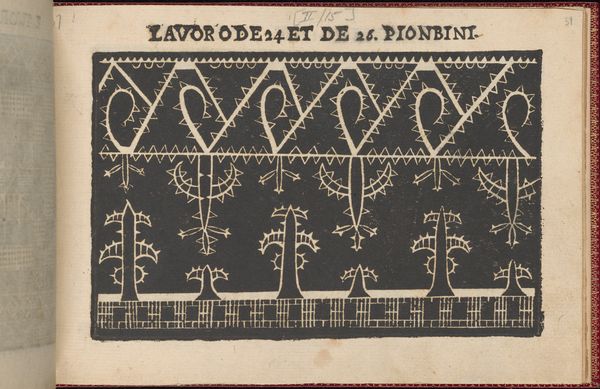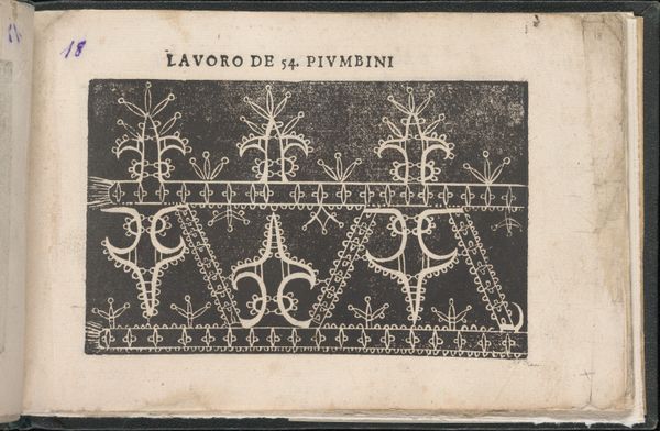 This is a page from "Gemma pretiosa della virtuose donne," or "The Precious Gem of Virtuous Women," printed in Venice in the early 17th century by Isabella Catanea Parasole. It is an instructional manual, meant to teach women the art of lacemaking. The image is a woodcut, a relatively simple process by which an image is carved in relief on a block of wood, which is then inked and printed. You can see the characteristic graphic quality of this technique, with its strong contrasts and textures. The pattern here is carefully composed, its repeating motifs creating a sense of rhythm and balance. Look closely, and you can see that it simulates the intricate structures that can be achieved with a needle and thread. Parasole wasn’t just an artist; she was also an entrepreneur who understood the value of design. Lacemaking was a valuable skill in this period and this book offered women a means to participate in the economic sphere, creating valuable objects for the marketplace. This page, therefore, represents more than just a pattern, it speaks to the intersection of craft, commerce, and female empowerment in the early modern world.