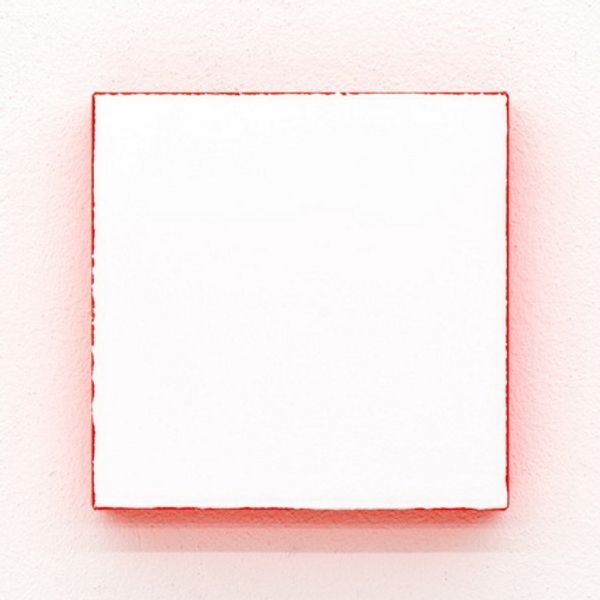 Curator: This is Claude Rutault’s "dé-finition/méthode #500: peinture en équilibre" from 2010, crafted with acrylic paint. It certainly demands attention at first glance, wouldn’t you agree? Editor: Absolutely, it strikes me immediately with its almost unsettling stillness. The bright red backdrop, the floating square… and then that unassuming beige circle resting at the bottom. It's quiet but also loud at the same time. Curator: It’s interesting that you perceive it that way because Rutault was very invested in demystifying painting, making it less precious and more accessible through a series of definitional methods. He often repainted walls the same color as the canvas hanging on it. His goal wasn't to create grand statements, but to examine painting's relationship to its support and the surrounding architecture, thereby interrogating display and production values. Editor: So the context becomes integral to the piece itself. Does that relate to the work’s title? It evokes balance. It's almost like it speaks to this tension between surface and support you mention, making the viewer consider their own position within the space, both literally and metaphorically. This can be read withing different discourses that involve spatial studies, performativity or relational aesthetics. Curator: Precisely. He aimed to strip away the traditional artist’s ego and center on the tangible aspects: paint application, the texture of materials, and the ways a painting alters and is altered by the context. Rutault created a conceptual framework by providing precise instructions for his paintings to be produced, highlighting the reproducible, the everyday and the economic factors of painting. Editor: Then perhaps this isn't just an exercise in abstraction, but an inquiry into the very mechanisms by which art attains meaning? What power structures contribute and sustain its supposed value? How are artists included or excluded according to race, gender and sexuality within hegemonic art spaces and networks? It could be viewed, therefore, as a critical comment on cultural validation itself. Curator: That’s a valid perspective. I focused on the sheer materiality and its engagement with architectural context. Editor: And that’s where the richness lies. Curator: Indeed. By engaging in these types of discourse, we reveal how process, form, and intention converge—creating a dialogue both aesthetic and critically reflective.