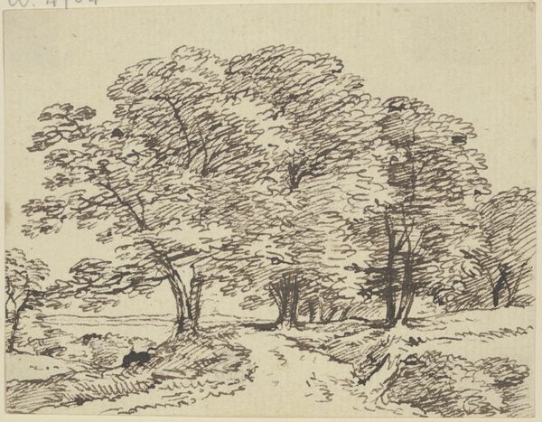 Franz Kobell made this drawing, "Baumbestandene Ebene, durch die sich ein Weg schlängelt, im Vordergrund rechts zwei rastende Wanderer," using pen and ink on paper. The thin, porous nature of paper lends itself well to receiving the fluid lines of ink. Kobell masterfully exploits these properties to create a landscape filled with intricate detail. See how the ink bleeds slightly into the paper, softening the edges of the trees and adding a sense of depth. The texture of the paper itself becomes part of the artwork. In this seemingly simple drawing, we can appreciate the artist's skilled manipulation of modest materials. The labor is evident in the thousands of tiny strokes, an intense process that captures a serene scene. This challenges the traditional hierarchy of art, inviting us to see the value in both the subject matter and the artist's craft.