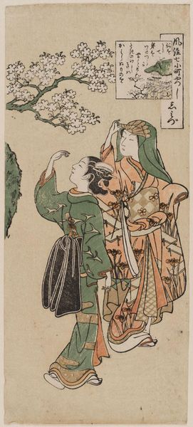 "Ono no Komachi by the Waterfall (Shimizu)" was created by Suzuki Harunobu in Japan, as part of his series "The Seven Fashionable Aspects of Komachi." Harunobu worked during the Edo period, a time of economic growth and social change, particularly for the merchant class who became patrons of the arts. Here, Harunobu presents two women in contemporary fashion, playfully referencing the legendary poet Ono no Komachi. Komachi was renowned for her beauty, talent, and later, her life of poverty and desolation. This print re-imagines her story through the lens of contemporary life. The women are depicted near a waterfall, a nod to Komachi's association with ascetic practices, yet their fine clothing complicates the narrative. This series reflects a broader cultural interest in reinterpreting classical themes within the浮世絵, ukiyo-e tradition, or "pictures of the floating world." Harunobu challenges traditional representations by blending the past and present, inviting us to reflect on the fluidity of identity. He captures a sense of longing, reminding us of the transient nature of beauty.