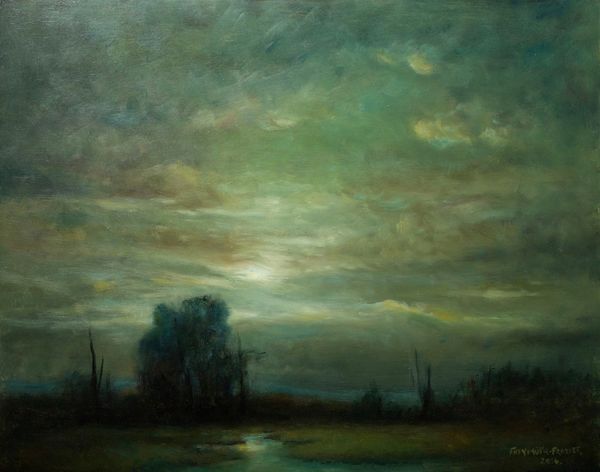 Editor: We’re looking at "Forest Road near Oranjewoud," painted in 1912 by Jan Mankes. The use of oil paint creates this really muted, almost dreamlike quality to the landscape. There’s a lone figure walking down this path and the whole scene feels very isolated. What do you see in this piece? Curator: Isolation is a key element, I think, particularly if we consider Mankes' personal history. He lived a largely secluded life due to his health, and this impacted his art significantly. How do you see the broader context of landscape painting influencing Mankes here? Do you see it adhering to tradition or trying to redefine the genre? Editor: I think he's doing something new, the realism tag is clear but his realism doesn’t depict nature as grandiose or sublime. This feels quieter, more introspective. Curator: Exactly. It breaks from traditional, heroic landscape painting. This shift reflects the changing role of the artist and the purpose of art within society at the time. There was a growing interest in exploring psychological landscapes and intimate scenes of daily life rather than solely celebrating national identity or the grandeur of nature. It’s interesting how a painting can encapsulate these cultural shifts so subtly. Editor: That's fascinating, I hadn't considered it that way! So, Mankes wasn's just painting what he saw, but commenting on art's role in society? Curator: Precisely. And he’s doing so through the visual language he employs—the muted colors, the simplicity of the composition, and that solitary figure walking away from us, perhaps symbolising a society turning inwards. Editor: It makes you think about who "we," the viewers, are in relation to the landscape in a very different way. Curator: Precisely. And in considering the institutional validation through the museum display we must think about this subtle defiance, because it provides a glimpse into broader dialogues around identity, societal roles, and our complex relationship with the environment, mediated through artistic expression. Editor: This piece really reveals the impact of culture and history on what seems like a simple landscape! Curator: Yes. It reminds us that even seemingly quiet, intimate scenes can resonate with the grand currents of history and artistic discourse.