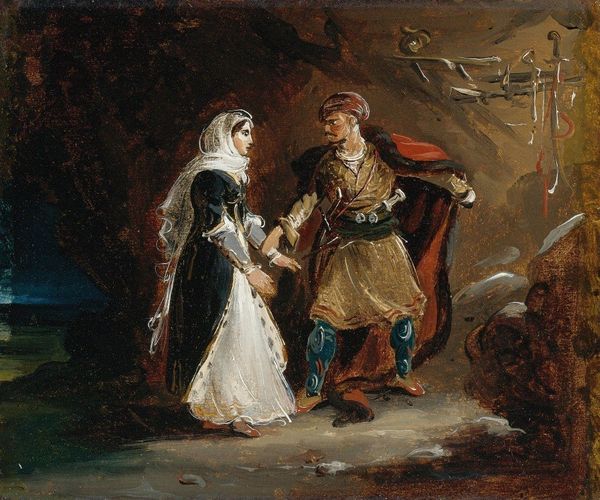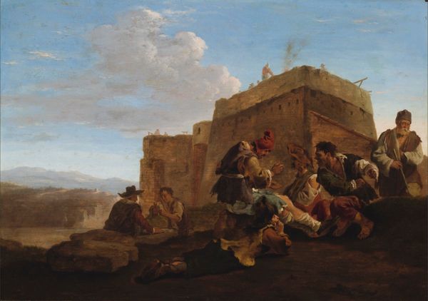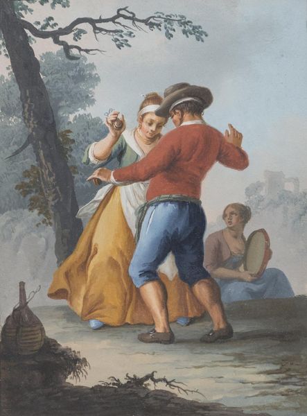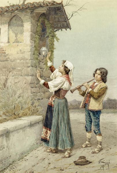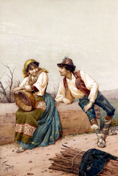 Editor: Here we have Anton Romako’s "Peasant Couple in the Campagna," created around 1865. The loose brushwork in watercolor gives the scene a transient quality. What speaks to you about this painting? Curator: The way Romako depicts the peasant couple really highlights the realities of rural labor. Notice how the materials the woman carries—hay or straw—are literally the fruits of their agricultural labor. The plein-air technique itself mirrors their engagement with the land; it’s not idealized but a raw representation. Editor: I see what you mean. It's less about romanticizing the countryside, and more about showing the… production cycle? The harvesting and all that. Curator: Precisely. Think about the materials he's using—watercolor, gouache—these were readily available and transportable, perfect for an artist wanting to capture scenes directly from life and possibly even sell them as tourist souvenirs later on. This brings up questions of accessibility and the commodification of rural life. What do you make of the contrasting depictions of the two figures' clothing? Editor: I didn't initially notice that. The man’s clothes seem more… theatrical almost? While the woman’s clothes, while elaborate, seem more worn and practical. Maybe to highlight the disparity in labor and appearance, a possible divide? Curator: It does, doesn't it? The male figure also has more ornate shoes than I expected to find. It really complicates how we perceive the class and social relations at play here. Editor: So it’s less a romantic idyll and more about unpacking the social and economic context. This makes me consider the implications of materials, processes, and presentation for these figures. Curator: It highlights the importance of interrogating what something is made of, and the means by which it comes to exist, to really understand the layers of meaning within a piece.