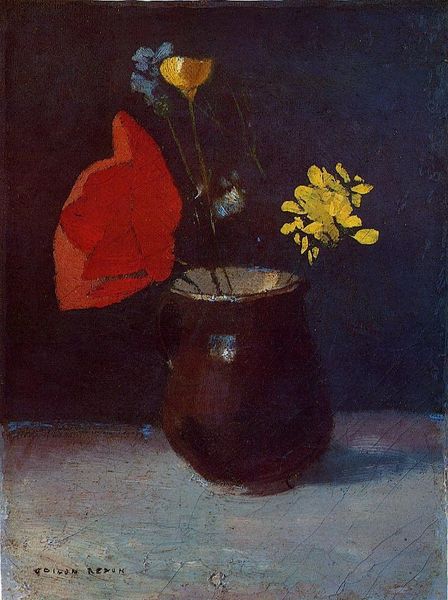 Odilon Redon created this still life, A Pot of Geraniums, using oil paint on canvas. It’s easy to overlook this humble scene, but let’s consider the materials, and what they tell us. Redon applied the oil paint to the canvas in loose brushstrokes, capturing the textures of the terracotta pot and the delicate petals of the geraniums. Oil paint, made from pigment suspended in oil, allowed Redon to build up layers of color and create subtle gradations of light and shadow, lending the work an atmospheric quality. The terracotta pot, mass-produced through industrial processes, reflects the rise of consumer culture and urbanization during Redon's time. While seemingly mundane, the pot and plant also represent the intersection of nature and industry, as well as the commodification of beauty. Redon elevated everyday objects to the level of fine art, challenging traditional distinctions between high art and craft. By focusing on the materiality of the artwork, and the social context in which it was created, we gain a deeper appreciation for the artist's vision.