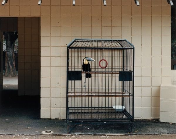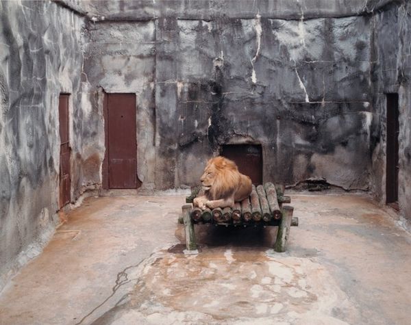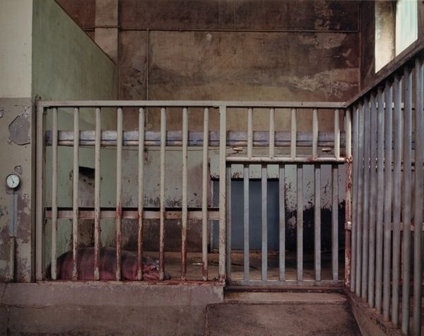 Editor: This is Volker Seding’s “Malay Tapir, Brookfield Zoo, Chicago,” a photograph taken in 1985. There’s a palpable sense of loneliness in this image; the stark enclosure seems to amplify the isolation of the tapir. What symbols or imagery strike you in this piece? Curator: Immediately, the enclosure itself stands out. Cages have historically been depicted as emblems of control and restriction but more subtly also as protection and care, referencing the "Zoo" as a place of curated experience, artificial or otherwise. It references the modern attitude to preservation versus presentation of nature, highlighting the uneasy truce between respecting animal life and using it for human edification. What emotions does it conjure for you? Editor: It definitely makes me question the ethics of keeping animals in captivity, even if it's for conservation purposes. The harsh lighting and the decaying walls seem to underscore that sense of confinement. Do you see any elements that speak to something beyond confinement? Curator: Yes. The sparse foliage above suggests a longing for a wildness, an almost Edenic remembrance that the tapir itself embodies— a living fossil whose existence speaks of a different time and world. This tension between confinement and the intimation of an untamed existence forms the photograph's powerful emotional core, a potent juxtaposition in visual storytelling. Editor: That's fascinating, I hadn’t thought about it in terms of historical memory. I'll definitely be pondering on that tension a little more. Curator: Consider how Seding utilizes light as a narrative tool – bathing one side of the animal while shadows obscure its eyes; each of those factors further inform my reading. Food for thought as we move onward.