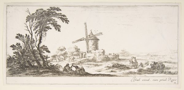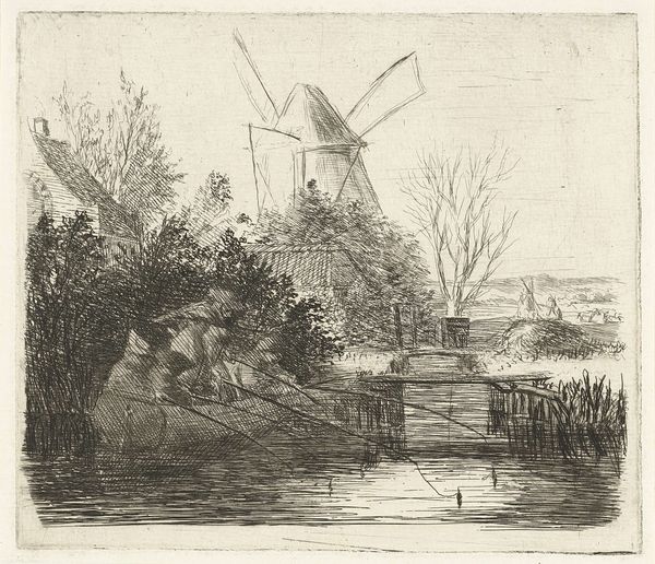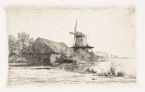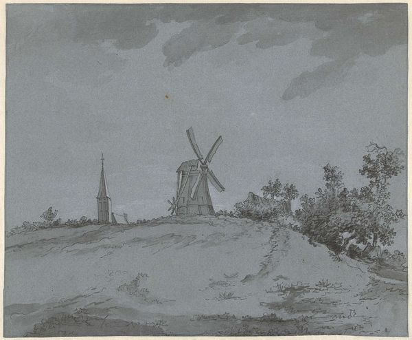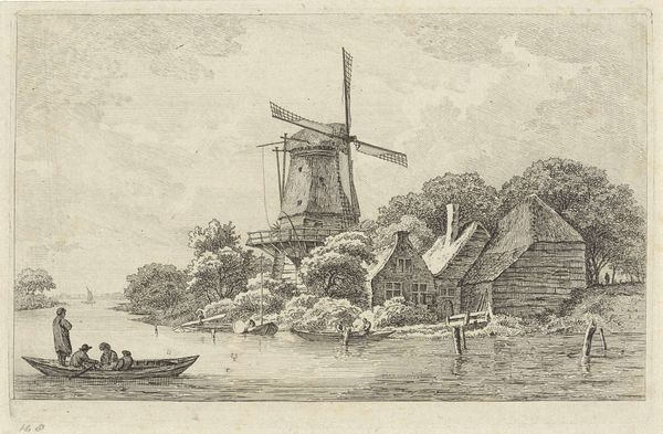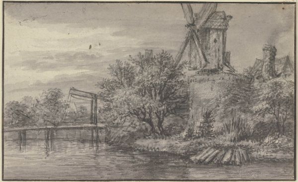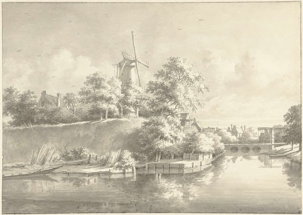 Curator: Let’s discuss "Gezicht bij Zaltbommel," a drawing attributed to Hermanus Numan, dating roughly between 1754 and 1820. It's currently held at the Rijksmuseum. What are your initial thoughts? Editor: It feels incredibly serene. The tonal range created by the pen, ink, and pencil suggests a damp but still, very still, day. Curator: Indeed. Numan situates us within a tradition of Dutch landscape art where the countryside is rendered not just as a picturesque backdrop, but also as a subtle reflection of the social order. Consider how the windmill, for example, dominates the scene, signaling technological progress and human intervention upon the landscape. Editor: The windmill's prominence makes me wonder about the production processes tied to it – the grain grinding, the bakeries…the means by which it provided flour to sustain the town. Look at the rough texture of the thatched roof juxtaposed with the finer details of the rigging; Numan paid close attention to materiality and its relation to labor. Curator: Precisely! And let’s not overlook the distant view of Zaltbommel. This drawing allows viewers – then and now – to project a sense of civic pride and connection to the locale. It implicitly reinforces notions of Dutch identity during a period of political and economic upheaval. Editor: Yes, I see that too. However, for me, it's really the small boatmen that captures my attention. What kind of work are they engaged in? Transporting materials? Fishing? These individuals provide a very direct relationship with the water and the river. The drawing serves as a material document, showing work, social practices, and dependency on available resources. Curator: I agree. While offering a peaceful veneer, the artwork alludes to an active and multifaceted social reality, reinforcing established societal structures and trade relations. Editor: It highlights not just the artistic skill, but the intersection of industry and everyday existence. These kinds of representations really shed light on a very functional past that depended directly on labor. Curator: Looking at it this way definitely adds further appreciation to the function this kind of scenery had in public life back then. Editor: Indeed! I find I'm consistently pulled into thinking about the laborers as artists who constructed this landscape together.
