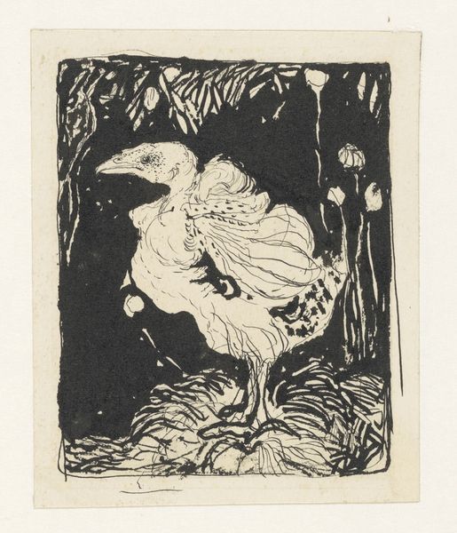 Curator: Nestkuiken, dating from 1917, a woodcut by Jan Mankes, has a striking stillness despite the delicate rendering. What are your initial thoughts? Editor: It's deceptively simple. There's an immediate sense of vulnerability radiating from this little bird, juxtaposed with a background that almost feels ominous. It's a bit unsettling. Curator: The bird, the nestling, acts as a potent symbol. In art, birds often signify the soul, the spirit's capacity for flight and transformation, here held in a precarious infancy. Considering Mankes’ oeuvre and the cultural mood of the period, its small scale suggests a profound introspection, typical of Symbolism. Editor: I agree about the vulnerability, but I also read a social dimension. Published amidst the turbulence leading up to the end of the First World War, a tiny, defenseless chick is hardly a celebration of national strength or colonial ambition. Could it be a subtle commentary on the fragility of life during wartime, and a plea for the protection of the innocent? Curator: A compelling argument! Mankes withdrew from the world due to his ill health, so he preferred painting the domestic sphere rather than the great turmoil of history, which certainly imbued his works with a particular character and introspection that aligns well with Symbolist ideals. Perhaps both interpretations hold merit. Editor: This type of image, circulated widely through printmaking, brings the concerns of the everyday into the domestic sphere, thus democratizing artistic messages. The woodcut's very texture, created by human labor, grounds the abstract notion of "fragility" in the tangible world. Curator: Absolutely. There is an immediacy that the woodcut offers. It captures not only the ephemeral, delicate features of the bird but, through its stark black and white contrasts, conveys an eternal struggle for survival and the simple beauty found in the cycle of life. Editor: Mankes provides us with the symbolic weight of hope and survival against all odds through simple yet effective naturalism. Curator: Yes, through the artwork's symbolism and rendering we arrive at an important dialogue between hope and hardship. Editor: It reminds me of art’s potential to bring quiet hope and small acts of resistance into homes worldwide.