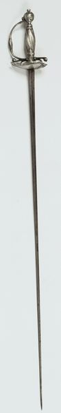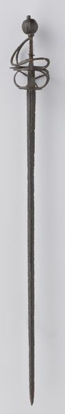 Curator: What strikes me most immediately is the elegance and simplicity of the blade’s design. The tapering form and the way light plays across the surface creates a stunning image, would you agree? Editor: Absolutely, the balance is exquisite. We're looking at a sword known as "Degen van F. Boogaard," believed to have been crafted sometime between 1813 and 1832. It’s primarily constructed from metal, including bronze elements in the hilt. Curator: I see elements of both utility and ritual represented. Bronze being used to embellish such a violent object… The cultural meanings behind these are endlessly interesting, it must have been an important status symbol. Editor: Indeed. The sword transcends its practical function; it represents authority, honor, and power. Curator: Consider how its smooth surfaces invite touch yet promise danger. This contradiction invites analysis. The polished finish gives a clear reading of its function. Editor: I'm especially drawn to the ornamentation on the hilt. Its spherical designs might resonate on a deep level within an archetypal system, they hint at wholeness, unity and continuity, not to mention immortality as an elite warrior class. Curator: Its aesthetic evokes similar examples found in Antiquity, or even further back. The design clearly shows what its creators intended, regardless of current values placed on craftsmanship. The interplay between form and intention are both powerful here. Editor: This object transports us to another world and is both a beautiful, sculptural form, but it’s hard to shake off how the shape alludes to battles and violence. The piece reminds us of our inherent connection to ancestral trauma and power. Curator: Well, that’s a compelling interpretation. Ultimately, analyzing the artifact’s formal properties illuminates the craftsmanship that continues to influence the culture memory to the current day. Editor: And I’d argue that contemplating the weapon's historical associations invites us to think more critically about how those power dynamics are coded through imagery and how our own culture reflects and replicates those symbols.
