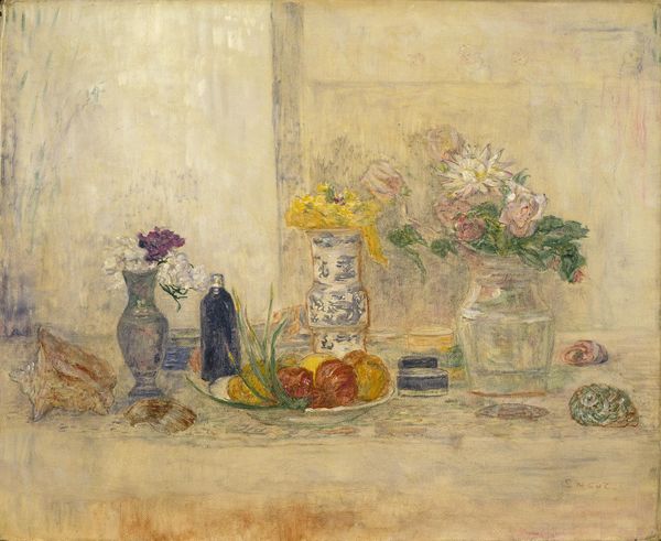 Curator: Frank W. Benson's 1921 painting, "The Silver Screen," held at the Museum of Fine Arts, Boston, presents a carefully arranged still life. What are your initial impressions? Editor: The subdued palette and diffuse light give it a wonderfully nostalgic feeling. There’s a certain weight to the composition, a stillness that suggests quiet contemplation. The thick brushstrokes create texture, adding another layer to the experience. Curator: Absolutely. The painting, executed in oil on canvas, employs a composition of seemingly ordinary objects infused with symbolic resonance. Notice the opulent vase. Vases, especially ornate ones like this, often symbolize containment and beauty but also fragility and the transience of life. And then, the overflowing bowl of fruit suggests abundance, but perhaps also impending decay. Editor: The positioning of the vase seems deliberate. It isn’t simply a decorative object; it appears almost as a guardian, watching over the ephemeral arrangement of the fruit. The dark hues within the depicted scenes on the vase also offer contrast to the vibrancy of the fruit. It anchors the whole composition. I would even say that the fruit presents something immediate and tangible while the vase embodies a narrative, an artifice, even an illusion of permanence. Curator: That interplay of ephemeral and enduring is key here. Think about the 'Silver Screen' in the title and how light is filtered across the scene—everything seems softened as though viewed through a veil, evoking a sense of dream-like detachment. Benson has cleverly used common motifs, and his choices of these specific domestic objects trigger emotional reactions related to warmth and comfort but also remind us of temporality. The light seems to further imply ephemerality. Editor: It’s the combination of all the elements: the texture, light, symbolic elements that lift the work into something more than just representational. A formal meditation and, at the same time, an image imbued with a powerful elegiac sentiment. Curator: I concur. Benson's arrangement does evoke a feeling that something precious is about to pass, that time is slipping away. Editor: Indeed, it’s a compelling use of stillness to evoke profound introspection.