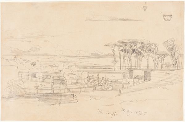 Editor: This is Theodore Rousseau's "Landscape," a pencil drawing from 1834, currently residing at the Minneapolis Institute of Art. It feels...ethereal, almost a dreamscape fading at the edges. What can you tell me about this work? Curator: Well, dreams and landscapes aren’t that different from each other, wouldn't you say? Look at the symbols emerging—almost struggling—from the paper. We have a suggestion of architecture, perhaps civilization itself. But is it rising or crumbling? Look closely at the tree, a gathering of emotional shading more than arboreal realism. Where do you imagine the landscape is located and what meaning could nature in this state have to people observing it? Editor: I hadn't considered the duality. It does feel transitional, doesn’t it? It could be anywhere, I guess, and nowhere in particular; it's as if this single tree represents solitude within civilization and wilderness and taming merging together as memory. It seems like more than just a depiction of nature; it's reflecting something deeper. Curator: Precisely. In Romanticism, nature becomes a mirror to the soul. Landscapes weren’t simply pretty scenes, they echoed emotional and psychological states. Notice how Rousseau uses the pencil almost as if he’s sketching the memory of a place, softened, with a kind of melancholy baked in. In which ways can memory and its distortion influence not only a person´s perception but their sense of belonging? Editor: It's fascinating how a simple pencil sketch can carry so much cultural weight. The way you described memory actually reshaped how I interpreted the buildings depicted. I came here for an understanding of the artwork and it shifted me towards cultural context and emotional resonance. Curator: And perhaps also that art carries symbols from shared experience and these can always lead us toward better understanding.