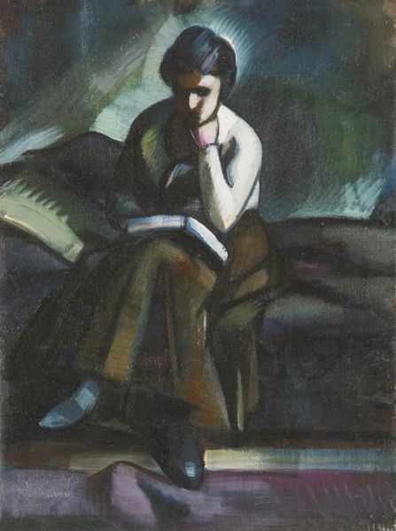 Curator: I see someone draped in shadow, looking down, almost like a classical statue cast in the colors of twilight. Editor: This is "Woman with Chair", painted around 1910 by the Hungarian artist Kmetty János. He worked with oil paint to bring this figuration to life, demonstrating a remarkable approach to portraiture. Curator: Portraiture is interesting because of what János is showing... the work's style feels so internal and dreamlike, the darks heavy, making me wonder what emotions the artist wanted to represent, because her expression is so subtle. The dark green background isn't helping! Editor: The sombre tones are really evocative, yes. The way the fabric drapes, for instance—notice how the darks and lights are captured. These aspects aren't just representational; they structure the artwork's meaning. The artist uses composition and color to give emotional weight to a quite traditional subject. Curator: What fascinates me are those splashes of reds near her arm, which creates a focal point as they break with the somber palette, so are they intentional or accidental? I find it hard to tell whether that chair is supposed to represent stability, or something less secure. Does that come from what it means in my life right now, or something deliberate? Editor: It seems the composition directs the viewer through contrasts of light and shade, that express its essence beyond the pictorial elements. I agree, there are ambiguities—art exists where meanings intersect! Curator: The more I look at it, the more it feels like he captured something almost ghostly—not in a scary way, but it’s really affecting in its restraint. Editor: Absolutely. There's so much here in the composition and color play beyond a representational aim. Hopefully, people will go to dive into this painting to examine themselves.
