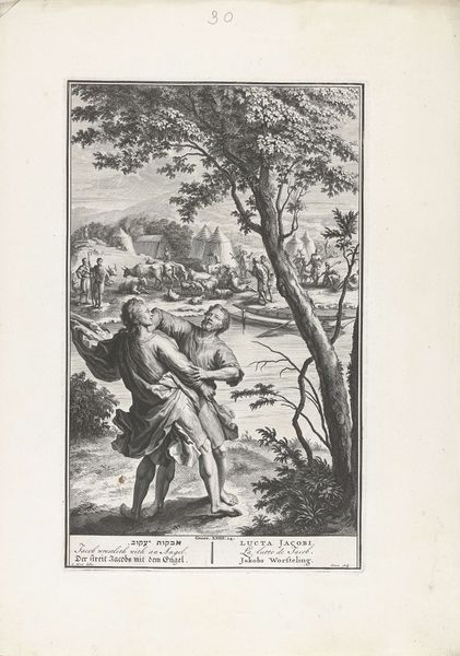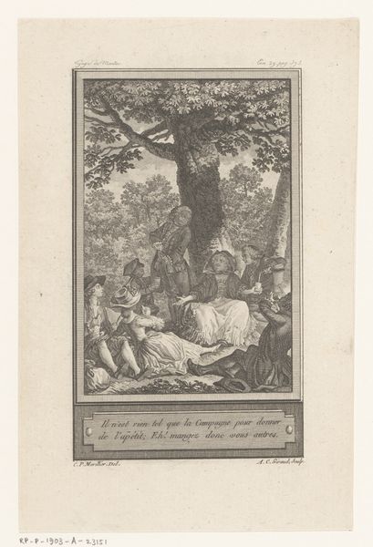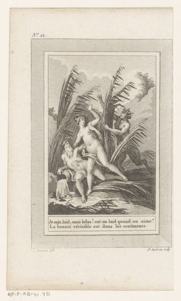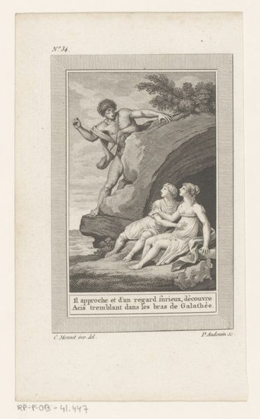 Editor: We’re looking at "Epimetheus opent de doos van Pandora," or "Epimetheus Opening Pandora's Box," an engraving by Pierre Audouin from 1801. It's got this old engraving style that feels very formal and classical. I'm initially struck by how stark and almost unsettling the scene is. The box seems to unleash chaos, yet the figures are so poised. What are your initial thoughts? Curator: Well, aren't we all a little Pandora sometimes, opening up boxes we shouldn't? It’s interesting, isn’t it, how Audouin captured this pivotal moment? The Neoclassical style lends a sense of order, but the scene itself is pure disorder erupting. Look at the figures emerging from the box—war, strife, misery— rendered as ethereal, almost graceful beings. Does that strike you as contradictory, that juxtaposition of form and content? Editor: Absolutely! The calmness of Pandora and Epimetheus versus the turmoil spewing out is very strange. I guess I would have expected more…drama? Curator: Perhaps that's the point! Think of Neoclassicism’s fascination with control, with reason. Audouin, perhaps, is suggesting that even in the most ordered societies, chaos lurks just beneath the surface, ready to burst forth. That the rational mind might always give way to intuition, our own human tendency for error! Do you think Audouin sympathizes with Epimetheus's plight? Or do you sense a note of censure? Editor: I hadn’t considered the idea of censure... I was so focused on the chaos! I guess I assumed Epimetheus was just a victim. But now I see a parallel with how societies, or even people, might be blamed for problems that are maybe inevitable. Curator: Exactly! This image reflects our never-ending struggle. An engraving about culpability, consequence, and maybe, just maybe, the faint glimmer of hope remaining in that fateful box. So much for something so simple as an illustration! Editor: Wow, I will definitely never look at Pandora's Box the same way again. Thanks for that deep dive!