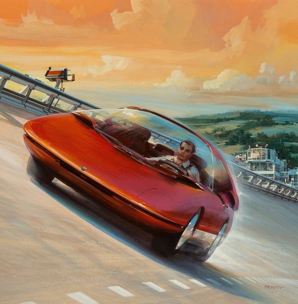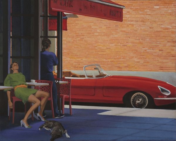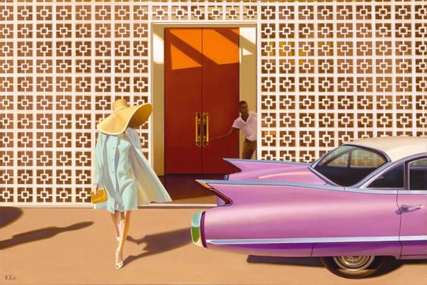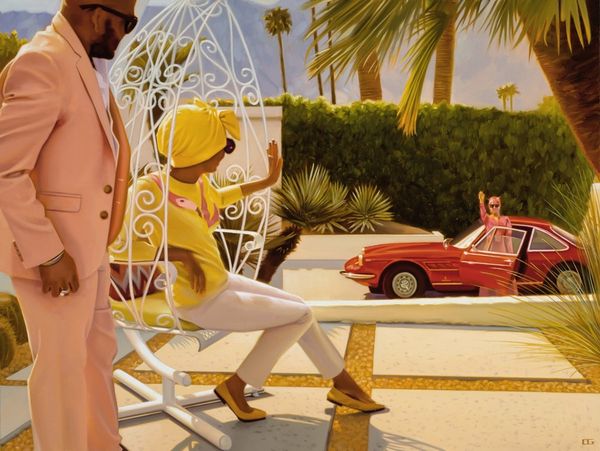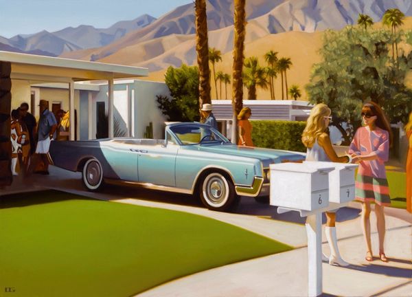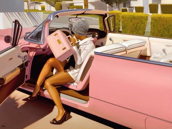 Curator: "Fancy Free" by Joseph Lorusso certainly captures a sense of breezy, carefree summer days. My first impression is of vintage vibes and a feeling of nostalgic warmth, don't you think? Editor: Yes, that sense of nostalgia is strong. What strikes me is the construction of leisure. This feels very staged, more like a movie scene than real life. I’m drawn to consider who this vision of carefree driving is intended to serve, which societal structure it reinforces, or perhaps questions. Curator: True. Lorusso seems very focused on how he applies paint in open-air methods, similar to plein-air painting traditions, focusing on material capturing fleeting moments under particular weather conditions and on location to inform their work. Here, it's a matter of the thick, almost gooey way the medium sits on the panel to suggest this feeling of the sunshine, creating these smooth and blended transitions for the cars, landscape, and people in the scene. What do you see from an institutional lens? Editor: I immediately think of the tradition of painting leisure, but with some updated messaging about consumer culture, class aspirations, and individual expression that feels very relevant to its context. Paintings like this also play a role in solidifying historical narratives, suggesting who gets to be "fancy free" and how these privileges operate in public consciousness. Curator: I see how these open cars, convertibles almost, imply something about the consumption and cultural value that an object can possess by way of access, especially if this image makes you remember particular histories and moments when people in particular communities had access to that and some did not. Editor: Exactly! It reinforces narratives and affects how we interpret reality. The deliberate rendering of such details underscores the image's function within broader socio-political discussions, impacting what we internalize and express. Curator: Considering Lorusso's process and material choices helps us contextualize how consumer imagery makes and keeps value through memory-making. These subtle qualities influence how audiences interact and understand art and material consumption as more than just economics, touching upon self-expression and history making. Editor: Absolutely. This painting’s existence within cultural institutions provides a specific view of “the good life,” reflecting the socio-economic narratives it chooses to celebrate. Examining these factors empowers viewers to critically assess art’s impact on cultural discourse.