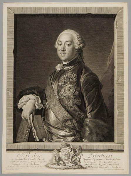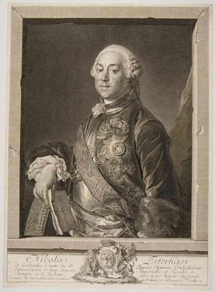 Curator: Here we have Mattheus Verheyden’s "Portrait of Coenraad van Heemskerck, Count of the Holy Roman Empire, Lord of Achttienhoven and Den Bosch," created in 1750. It's an oil painting, quite characteristic of the Rococo era. Editor: It strikes me immediately with its blend of formality and, surprisingly, tenderness. The subject is clearly a man of stature, but the way he cradles the dog softens his image. It’s quite an intimate gesture for a formal portrait. Curator: Absolutely. Van Heemskerck's portrait is interesting from a social history perspective. These displays of status through finery and association— note the prestigious title—were crucial to maintaining social hierarchies. Rococo portraits served to idealize and legitimize power. Editor: It's intriguing how the artist tries to normalize these figures through their dogs and convey the notion of having a tender and delicate soul to perpetuate that their high status and social positioning were actually humane. How successful do you think he was at bridging that divide, especially when we consider Verheyden's status as a history painter for the elite? Curator: Well, artistic license always plays a role. It’s important to see how portraiture supported prevailing notions of class. His pose and costume do not invite questioning of his privileges but, simultaneously, are used to create a favorable impression that supports existing structures. The subtle color scheme serves well that agenda. Editor: I agree. Thinking about the dog, it can also symbolize faithfulness, hunting prowess, but it also feels like a tool to further domesticate the public perception of Coenraad. What about the details? The frilly cuffs and gold braid trim signal high social standing without saying it outright. Curator: Yes, precisely. Every element, from the carefully arranged wig to the pastoral landscape backdrop, contributes to a cultivated image of refinement and authority. Editor: For me, the power dynamics inherent in commissioned portraits during this period are so palpable here. Verheyden delivers what was requested, following social conventions of the era and reminding us that these paintings reflect their time's power dynamics. Curator: A fantastic painting overall; looking through this painting gives us insight into social history, painting trends and portraiture altogether, something visitors can carry into the museum’s next room. Editor: I walk away thinking how powerful artworks from past eras, as beautifully executed as this painting, remind us to continually question whose stories and what versions of the world were historically privileged and seen.