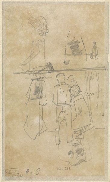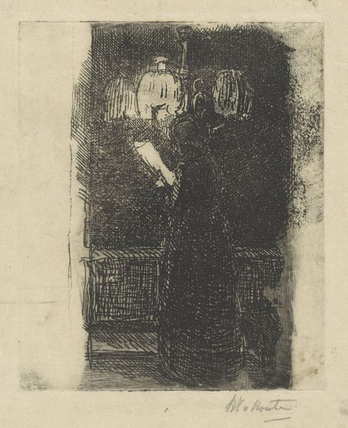 Curator: Jiri Balcar's "Party II," an etching from 1968. Something about it makes me feel uneasy. What's your take? Editor: The faces seem to be missing, right? Almost erased, replaced by darkness. Like they are ghosts. It feels eerie, like a party happening in some strange purgatory. Curator: You feel that, too? Good, it’s not just me. Etching— the scratching, the biting of acid—it’s so visceral. In the 1960s in Czechoslovakia, under Soviet influence, there was huge censorship, an end to free expression. Social Realism became pretty stale, with lots of pressure on artists to follow the norms. Maybe this represents the angst that many people felt then? Editor: Definitely. There are visual clues—the faceless figures, their almost featureless dresses; it feels representative of communist power's intention of controlling individuals, turning citizens into anonymized entities of the state, devoid of personality, monitored by the authorities. See the two car spark plugs on the wall! Is he trying to be playful with an element of humor, even a nod to some kind of industrialisation theme that socialist leaders emphasized? Curator: Or are they spying devices? They could just be machine parts, which do give the print this factory feel that contrasts starkly with the "party" theme in the title. So are these working class people having a break or going to clock in? The figure slumped at the bottom right, that seems so representative of a dejected figure unable to feel hopeful. Also, look at the time frozen on the clock face! Such melancholy! Editor: And yet, there's some interaction between those women and him; it feels like there might be solidarity even when things are hopeless. What’s up with the architectural drawing hung up high on the wall—some reference to Soviet building? Curator: Perhaps! This print contains many ambiguities which may allude to multiple layers. Thank you for the thoughts! This artwork makes me think about what power dynamics mean to us and it is very much welcome! Editor: Precisely. To engage with its themes makes you engage with a turbulent era in the former Czechoslovakia—one that still speaks to us today.