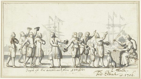 This drawing by Domenico Artaria captures a moment filled with movement, framed by delicate strokes of brown ink on paper. The eye is drawn to the detailed carriage at the center, its wheels and occupants rendered with meticulous precision. The composition invites us to consider the family members on foot, offering a farewell. Notice how the artist plays with scale and perspective, using the lines to create a sense of depth and emotional distance between those departing and those left behind. The architecture in the background is minimal, yet it provides a horizon that sets the stage for this intimate, familial scene. The use of a single color creates a sense of unity, allowing us to focus on the lines and forms that define the characters and setting. This aesthetic choice invites a semiotic interpretation, as each carefully placed stroke functions as a sign, contributing to a narrative about relationships, farewells, and the human experience. The drawing is not just a visual record but an exploration of human connection through its formal elements.