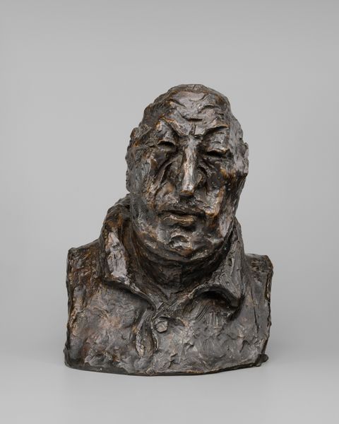 Editor: This bronze bust is believed to represent Horace-François-Bastien Sébastiani, dating from sometime between 1832 and 1940, by Honoré Daumier. There’s something very somber about it. All those lines in the face and clothes give it such a weighty feeling. How do you interpret the significance of this portrait? Curator: What's compelling to me is Daumier's choice to represent a public figure like Sébastiani, potentially after his death. Consider the time this sculpture was made and the social landscape: Sébastiani was a Marshal of France and a prominent political figure. Daumier, often a satirist, seems to approach this subject with… perhaps not reverence, but certainly solemnity. How does representing power through bronze shape the perception of authority and legacy? Editor: That's interesting. The rough texture feels almost like an unidealized, immediate take compared to the smoother marble busts I'm used to seeing. It seems less about glorification and more about capturing the essence of the individual. Curator: Exactly! Think about the political climate during Daumier’s career. Sculptures weren't merely decorative; they were powerful statements. Do you think that choosing a medium and style that are less explicitly celebratory can be a statement of dissent, or perhaps even an attempt to engage with truth in a different form? Editor: It's like the sculpture is participating in a political conversation, pushing against the established way of portraying leaders. That's a really thoughtful perspective on how materials and styles can carry social weight. Curator: Indeed. So much of art history comes down to these decisions, doesn't it? Thinking critically about artistic choices unlocks these deeper narratives. Editor: I hadn’t considered the impact of bronze on its cultural impact; it really adds a whole new layer to appreciating this sculpture. Thanks!