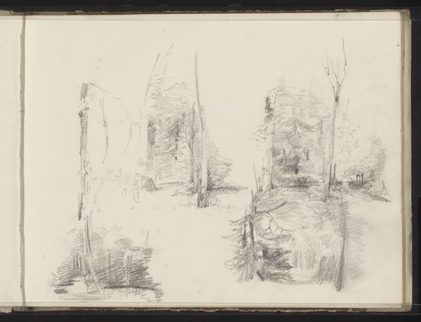 Editor: Here we have Johannes Tavenraat's "Entrance to the Ice Cellar of Rosendael Castle," a pencil and colored pencil drawing from 1833, currently held at the Rijksmuseum. I'm struck by its almost haunting quality. What’s your perspective on this particular work? Curator: The Romantics were all about hidden or secret spaces that offered psychological insight, right? In the 19th century, country estates became symbols of societal hierarchy. I see a contrast here: this beautifully rendered natural scene juxtaposed with the ice cellar entrance, implying control and preservation – even manipulation – of nature. What kind of status did Rosendael Castle have at the time of this piece? Editor: I know that Rosendael Castle itself dates back centuries, so it was likely a very historically significant location at this time. How would the public typically view images of estates during this period? Curator: Often, these images functioned almost like promotional material, emphasizing the wealth and power associated with the family or the individual. But here, the perspective Tavenraat chose and the secluded subject, the ice cellar entrance, it avoids an obvious expression of power, shifting attention to this space where nature is unnaturally delayed by human ingenuity. What does that entryway say to you? Editor: It feels mysterious, almost like a hidden gateway into the earth itself. Maybe it’s not only about showcasing control of nature, but a kind of reverence for its power as well. Curator: Exactly, there's a dialogue between our societal need for control and the ultimate recognition that nature holds its course. Seeing these romantic renderings through our contemporary, ecologically charged lens creates a very interesting contrast. Editor: This definitely helps me appreciate not just the artistry, but also the societal implications within such a simple drawing! Thank you for this perspective.