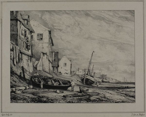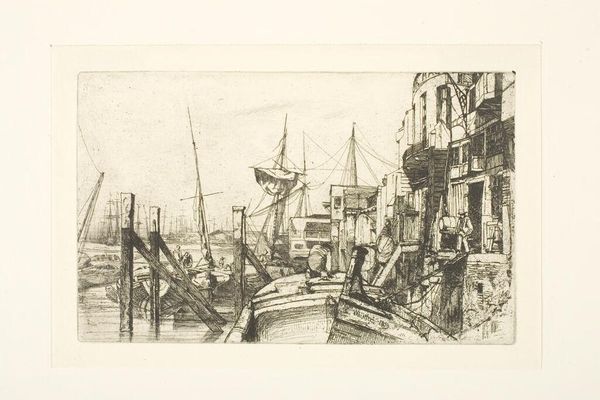 Curator: This etching is titled "Thames Police," created by James Abbott McNeill Whistler. Note the dimensions; it's a rather intimate plate, only about 6 by 9 inches. Editor: The grittiness of the scene strikes me first—a real working river, heavy with the weight of industry and perhaps something more...illicit. Curator: Whistler masterfully uses line to create a sense of depth and atmosphere. See how the density of hatching increases in the darker areas, building form and shadow. Editor: Symbolically, water often represents the unconscious. The Thames, then, becomes this murky repository of London's hidden aspects, both commercial and criminal. Curator: And note how the composition itself, with its emphasis on the horizontal lines of the river and docks, reinforces this feeling of grounded reality. Editor: True. This is not the idealized vision of the river you'd find in Turner; this is about the everyday, the unseen. Whistler captures the undercurrents of London life. Curator: An excellent point, and it's all meticulously rendered through the careful application of etching. A real tour de force of the medium. Editor: A fascinating glimpse into the cultural landscape of Victorian London, made even richer through Whistler's careful hand.