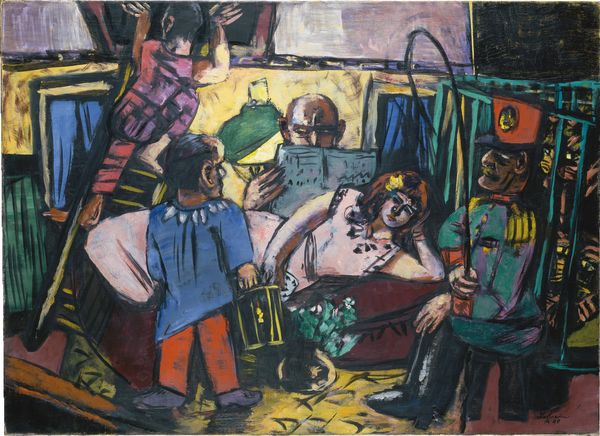 Editor: This is "Music," an oil painting created in 1933 by Philip Evergood. It portrays a vibrant orchestra, and the sheer number of figures packed into the frame gives it a sense of boisterous energy. What's your interpretation of this work? Curator: The sheer act of creation, the process of layering oil paint to depict this scene of collective labor, immediately stands out. Look at the varied textures and brushstrokes Evergood employs. Each musician, each instrument is rendered with a distinct touch, highlighting the individual contributions to the overall sound, to the collective project. How do you see the choice of materials contributing to its social message? Editor: That’s an interesting way to look at it. The rough application of paint and the somewhat caricatured figures lend a populist, almost gritty feel, doesn't it? I hadn’t considered how the medium itself enhances that. Curator: Exactly. And consider the period: 1933, deep in the Depression. Doesn’t the raw, almost hurried application of paint, the focus on the working musician, speak to the urgency and realities of that time? Art wasn't simply about aesthetics, but also about survival and community. How might viewing it in this economic context shape our understanding? Editor: It completely shifts my perspective! I initially saw it as a lively, almost chaotic scene, but now I see the depiction of labor and community amidst hardship. It’s more than just a depiction of an orchestra. Curator: Precisely! By examining the material conditions of its creation and the social context it reflects, we uncover a deeper narrative beyond the surface image. It really showcases labor, materiality, and the value of collaboration during that period.
