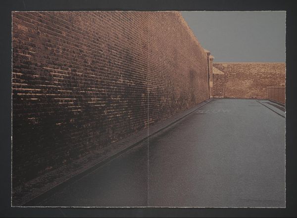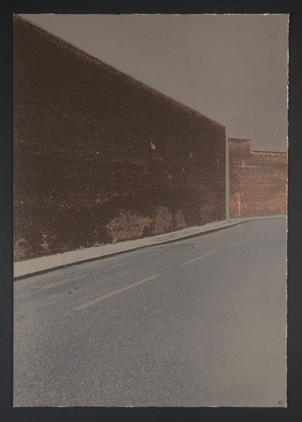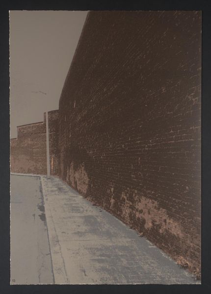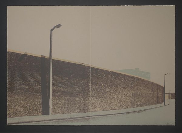 Curator: At the Tate, we have a print by Gerd Winner, an untitled work showing a street view. It presents two nearly identical perspectives, one above the other. What's your initial reaction? Editor: Bleak. And repetitive. It's like a visual echo, amplifying the emptiness. I feel trapped by those looming brick walls. Curator: The duplication could be seen as symbolic. Perhaps mirroring the cyclical, unchanging nature of urban life, or the psychological effect of routine. Editor: I suppose it's a stark reminder of how our environments can shape our inner landscapes. Still, I'd rather see a sunrise. Curator: It encourages contemplation on the built environment and its effect on our minds. Editor: Well, it certainly made me think... about needing a vacation!