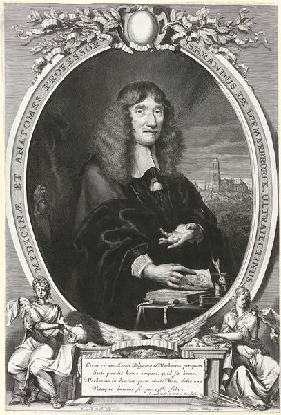 Editor: Here we have Gėrard Edelinck’s portrait of Madeleine de Lamoignon, likely completed between 1687 and 1707. It’s an engraving and really gives off this air of sophisticated reserve. I'm particularly curious about how her social standing might have been portrayed through the art of that time. What's your interpretation of the societal implications present in this piece? Curator: The portrait offers an interesting look into the dynamics of status and representation in the Baroque era. Consider the meticulous detail rendered through engraving, a medium accessible to a broad public thanks to printmaking. How might the artist's choices in depicting her clothing, the details in her gesture, or the family crest all contribute to constructing her public identity within the political framework of the period? Editor: That's insightful! The family crest especially suggests power, doesn't it? And her gesture almost seems like she's presenting herself to society. It makes you wonder about the performative aspect of portraits back then. Curator: Exactly. In this era, portraits weren't just likenesses; they were tools used to reinforce power structures and familial legacies. Do you see the ways in which Edelinck’s portrait is perhaps participating in and subtly shaping perceptions of Madeleine de Lamoignon’s place in history and her cultural value? Editor: It's fascinating to consider how portraits, even seemingly straightforward ones, play such a crucial role in shaping societal narratives. I hadn’t fully grasped the power they wielded! Curator: Understanding the social context transforms how we view such artworks. Looking at it this way helps reveal the complex relationships between art, power, and society.