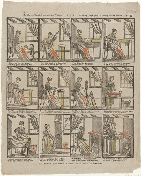 Curator: Welcome to the Rijksmuseum. Here we have "De boomwol," a print dating roughly from 1894 to 1959, artist Gordinne. It details the cotton production process, from plant to product. Editor: Immediately striking is the almost storyboard-like layout. The composition is sectioned into smaller scenes, giving a fragmented narrative feel. Curator: Precisely. Each vignette offers a key stage. We move from the cotton harvest, depicted with racial stereotyping, to carding and spinning and onto dyeing and sales. It’s a holistic view. Editor: It screams of the industrial revolution, this systematized exploitation of resources and labor. Look at the carding scene: the mechanization and raw material fill almost the whole image. Curator: Indeed, the rhythmic linearity achieved from stage to stage creates a visual structure. Consider how Gordinne contrasts the open fields with the confined factory space. The perspective here is crucial. Editor: For me, the heavy emphasis on material transformation becomes the central theme. How raw plant becomes usable fabric in its myriad transformations. From the labor-intensive harvest to the machines to a finished product. Curator: I also find the implied consumerism quite interesting in these later frames. There’s the distinct look of luxury in the details around shopping. Editor: What that creates is the ultimate distance from the hands-on processes at its foundation, where it is made, how it's made. What a statement on the distancing effect of industrialism from primary resources. Curator: That tension between nature, industry and commerce feels key to deciphering this unusual pictorial. I appreciate how it marries the pictorial to the process. Editor: I agree. Reflecting on this work, I am struck most by how its graphic style encapsulates both colonialist enterprise and budding capitalist system, displayed on what seems like an instruction sheet of manufacture.