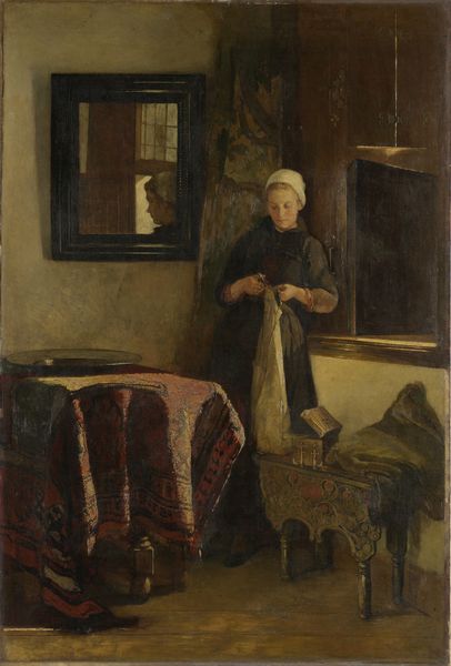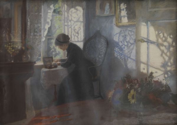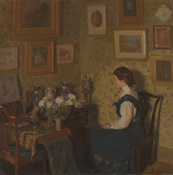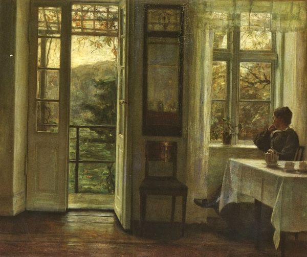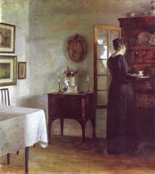 Editor: So this is Carl Holsøe’s “Woman with a Fruit Bowl,” painted in 1900. It's an oil painting, and the scene is so serene, almost… staged, I think? All the objects placed so deliberately. What do you see when you look at it? Curator: I see a carefully constructed image deeply embedded in the social fabric of its time. Consider the concept of "Intimism." It wasn’t merely about depicting intimate scenes; it was a movement shaped by societal expectations about women and domesticity. Holsøe places this woman squarely within a bourgeois domestic setting, framed by the order and wealth of her surroundings. The objects you mention -- are they markers of status or tools for oppression? Editor: Oppression? That's interesting. It seems so quiet. Curator: Exactly, and whose quiet is that? Reflect on who was choosing what to display in their homes in 1900 and, even more critically, which people are represented. The samovar, for instance: is that included simply as part of her reality? Is there anything else that can inform you of that object's socio-cultural value in that time? Editor: I hadn’t thought about it that way. I was just seeing a pretty picture. So you’re saying that how and where the painting was displayed back then could reflect, or even enforce, specific roles for women and notions of social standing? Curator: Precisely. And by understanding those power dynamics, we gain a more comprehensive view of the painting and the world it reflected. Consider how museums like ours, even today, participate in either upholding or challenging these dynamics. Editor: This gives me a lot to consider – it’s not just what’s on the canvas but also where that canvas exists in the world and who is allowed to see it. Thank you for opening my eyes to that perspective. Curator: My pleasure, this kind of attention to history really opens up how images make claims to meaning.