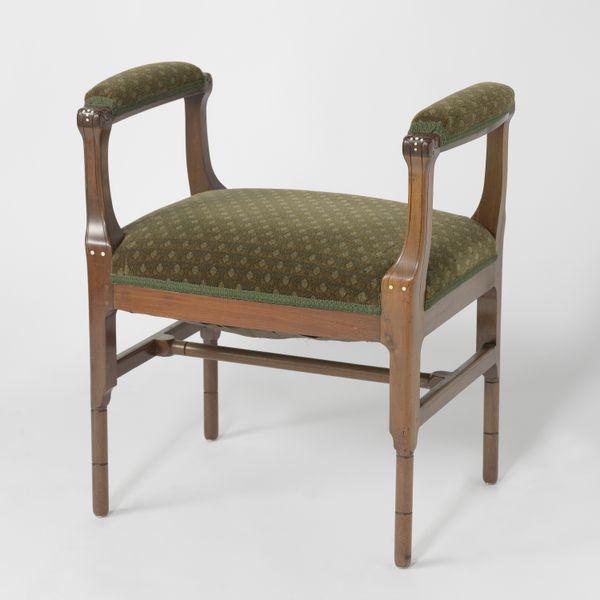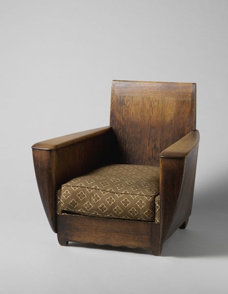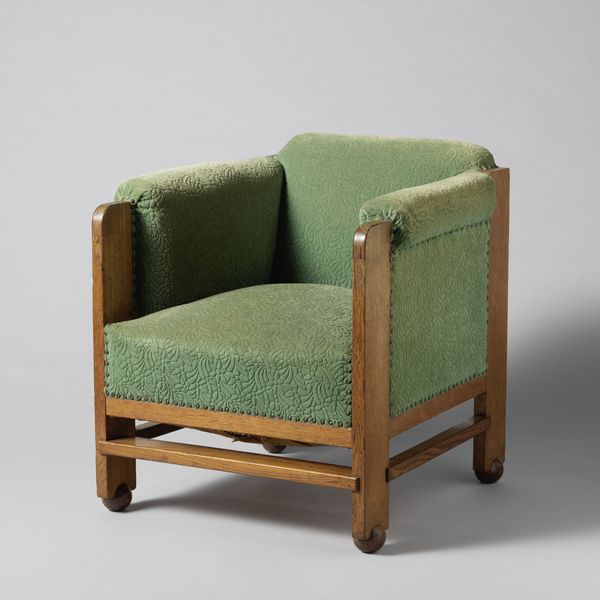 Editor: Here we have Piet Kramer's "Armchair upholstered with green wool and with armrests that end in animal muzzles" from around 1916 or 1917. I find the green wool covering and the carved animal heads oddly comforting. What catches your eye in this piece? Curator: The animal heads, definitely. Notice how they're stylized, not realistic. They seem to guard the sitter, a silent promise of protection and power. Animal motifs in furniture often speak to a deep connection with nature, even in urban environments, invoking primal energies. Does this piece make you think of other mythic, symbolic animals or beasts? Editor: Hmm, a little bit! It reminds me a little of, like, heraldry, and the symbolic animals that you would see there. That connection with power feels right, though. Is that the only way the animals could be interpreted here? Curator: Not at all! Consider the material, too - the plush wool. This chair might represent both comfort and status. The green itself links the domestic sphere to nature, fertility. Green has a rich, varied history from poison to pastures, but also luck, rebirth, renewal! Look also at the lines, their stark angles, typical of Art Nouveau, signalling "modernity." In what kind of space do you imagine this chair belonging? Editor: I hadn't really considered all the symbolism behind the green color! And I like the idea of it sitting in conversation between natural comfort and powerful status. Maybe in a study? Somewhere you can, like, sit and think and plan your schemes? Curator: Precisely! Kramer's blending of natural and abstract forms creates something quite remarkable, connecting the sitter with potent cultural memories and a promise for the future. Editor: I'll definitely see furniture differently now, as carrying its own weight of history and meaning!