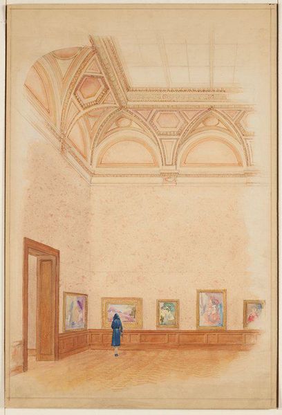 Vincent G. Stiepevich created this watercolor rendering of a proposed wall decoration for the Old Corcoran Gallery of Art. Watercolor, as a medium, has a fascinating duality. It is portable and relatively inexpensive, which makes it ideal for on-site sketches and studies, but it can also be used to create highly detailed and finished presentation drawings, as we see here. The rendering gives us a glimpse into the design process of the late 19th century, when architects and designers like Stiepevich relied on hand-drawn visualizations to communicate their ideas to clients and builders. Every line and brushstroke represents a conscious decision about materials, colors, and spatial relationships. Notice the way the artist has used light and shadow to give depth to the decorative relief above the paintings, and the subtle variations in the wall color that add a sense of realism. While seemingly a simple drawing, this work represents a significant investment of time and skill. It serves as a reminder that even in the age of digital design, the human hand and eye remain essential tools for creative expression.