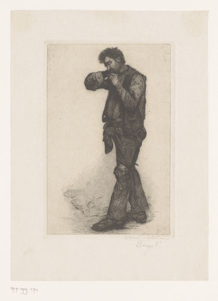 Auguste Danse made this work, "Landarbeider knielt in het veld voor zijn gebed", using stone lithography. Danse lived through a time of immense social change and industrial expansion, shaped by his experiences and beliefs. The artwork shows a man kneeling outside. His hands are clasped together as he is praying. We are invited to consider the convergence of labor, faith, and class identity in the life of a rural worker. What does it mean for a laborer to express devotion amidst the toils of daily life? The man’s connection with nature is palpable, and his posture suggests a deep sense of humility. Is it the representation of faith as a source of solace, or an acknowledgement of the difficult socio-economic circumstances endured by the working class? Consider how the scene resonates with your own understanding of labor and identity, the intersections of personal devotion and broader societal forces.