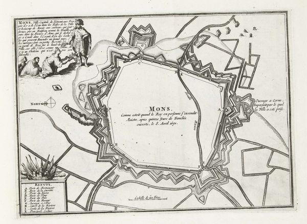 Curator: This intriguing print is entitled "Plattegrond van Saarlouis," dating to about 1693-1695. The identity of the artist is unknown, but it’s held in the collection of the Rijksmuseum. Editor: It's captivating. The sharp lines of the fortification create such a dramatic geometric pattern— almost a kind of visual fortress. There's a cold, austere quality that immediately strikes me. Curator: Indeed. The Baroque period, to which this print belongs, favored a grand, almost theatrical aesthetic. This piece uses that drama, but to project power through architectural precision, suggesting the imposition of control and order. Editor: It’s like a carefully orchestrated visual declaration. The rivers, rendered so precisely, create visual flow around the structure; its star shape pushing out with near threatening angles. There is definitely a statement being made about centrality and inescapable authority here. Curator: Absolutely. The city plan as image, also performs a role as a political declaration, an attempt to create the impression of an impenetrable urban structure. Those sharp angles act almost like sun rays from the center point: domination. Editor: The allegorical figures flanking the "SAAR-LOUIS" inscription solidify this theme, lending a near militaristic feel. They act as symbols of strength. This map projects not just a place but a constructed identity; a fortress made not of just walls, but also meaning. It speaks volumes about the era's power structures. Curator: Agreed, the cultural weight here is impressive. This engraving, far beyond just cartography, conveys the ambition and cultural landscape of its time. A statement through strategic deployment of form and imagery. Editor: It's amazing how a seemingly simple plan can radiate such intense ideas about control and dominion, just through composition and deliberate lines. The visual encoding is impressive!