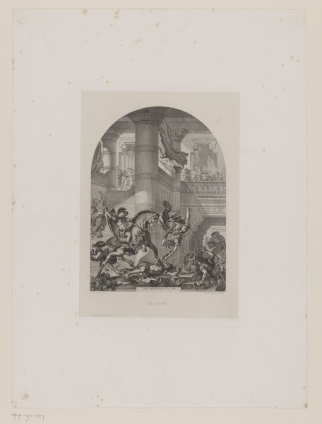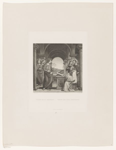 Curator: This etching, dating between 1863 and 1898, captures "Interieur van de Sijpekerk in Nieuw-Loosdrecht" by Auguste Tilly. Look closely at the level of detail achieved through the print medium. Editor: There is an immediate sense of reverence. The somber gray tones contribute to the subdued, almost mournful atmosphere within this church setting. Notice how the strong verticals and architectural features frame the human activity below. Curator: Indeed. The artwork portrays a specific community within the walls of their house of worship. The scene depicted is not a formal service but most probably a local church meeting that gave individuals communal representation in social activities of that period. These social paintings reflect everyday stories. Editor: Speaking of depiction, observe the intricate etching lines – they skillfully convey depth and texture from the imposing pillars to the chandelier hanging overhead, providing an almost tangible reality to the church interior. Notice how the window seems to beckon as a gateway to the divine. Curator: Precisely. The setting isn't purely a visual one. It mirrors societal ideals of piety and collective identity of a late nineteenth-century European village that found solace and meaning through religious devotion during shifting sociopolitical transformations. The church wasn't just a sacred location; it symbolized social belonging. Editor: You can also analyze how the eye is drawn from the shadowed foreground, where we find these indistinct groups, moving upward to that illuminated window – the formal arrangement reinforces our connection to hope, guiding our eyes—and perhaps our spirits—skyward. Curator: And beyond mere technique, the choice of representing ordinary church folk underscores shifting dynamics during a period marked by secularisation where representations of such subjects were critical assertions that acknowledged individual agency and community existence at large. Editor: Overall, for me, the appeal lies not only in what Tilly depicts, but also in how he conveys the mood. His treatment creates something intimate despite that large setting within a community—I'm particularly taken by how effective black and white is when conveying nuanced emotion like hope and reverence, making this image memorable. Curator: From a historian's vantage point, reflecting upon its capacity to highlight critical periods of community formation as modernity unfolded offers enduring and significant understanding from past interactions. It’s always a learning opportunity regarding people's stories via spaces just as they envisioned their positions as individuals of impact through group involvement!