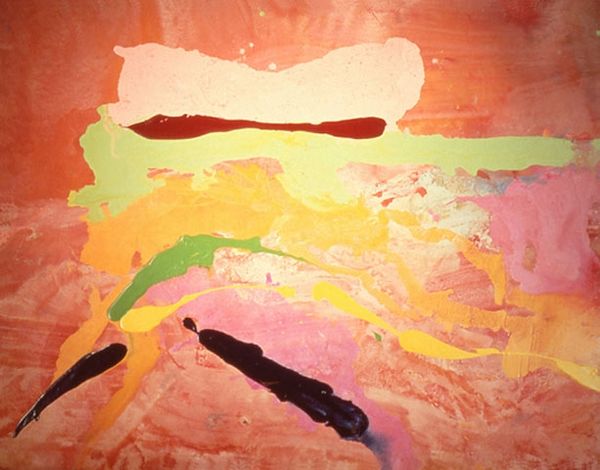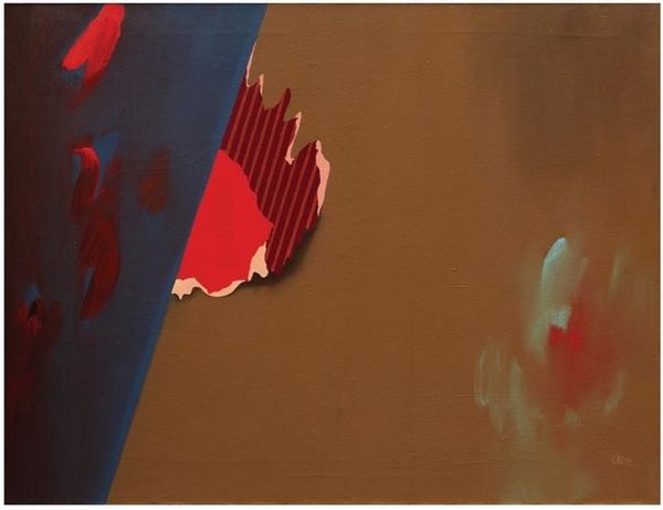 Curator: Lynda Benglis' "Odalisque: Hey Hey Frankenthaler," created in 1969. Acrylic paint directly on the floor, a real statement! What are your initial thoughts? Editor: Well, it certainly throws you for a loop! The colors are almost jarring, and the way it just sits there on the floor...it feels almost rebellious. Like paint escaped its canvas and decided to do its own thing. Curator: Benglis was playing with exactly that sense of challenging norms. Think about Abstract Expressionism at the time, so much heroic scale. Here, it is almost anti-heroic, right? Subverting traditional notions of sculpture and painting by bringing the process directly into the architectural space. Editor: I get that. The informality is striking. It's almost as if she’s saying, "Here's paint, here's the floor—deal with it." Was it trying to push back against the predominantly male art world? The “heroic” painting styles we often associate with, say, Pollock? Curator: Precisely! Benglis has often talked about challenging the male-dominated art world. She took inspiration, like in the work’s dedication to Frankenthaler, while establishing her voice. I also think about how the piece messes with gallery expectations –it's there, on the floor; you cannot avoid interacting with it. Editor: So, it's like a calculated mess? A way of taking the grand gestures of her male contemporaries and feminizing them, or rather, democratizing them by making the art literally accessible on the floor. Curator: Exactly! The form becomes secondary to the vibrant acrylic; the mess feels intentional and very engaging, it also suggests a performative and intuitive action. How space defines our encounter with art is being questioned right here. Editor: It makes me think about the temporary nature of some performances. You make me want to tread all over it to become one with the gesture. Curator: Benglis dares us to reimagine artistic hierarchies and how we engage physically and intellectually with artworks. The work becomes part of life; here you can see a critique against conventions while building and owning a completely individual visual language. Editor: This makes me appreciate Benglis' bravery. What an incredible work! Thanks for shedding light on this perspective.