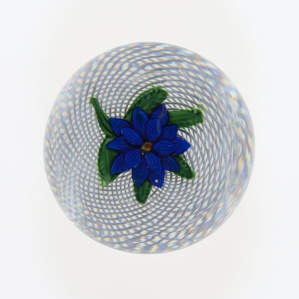 This glass paperweight was produced by the Boston and Sandwich Glass Company sometime between 1825 and 1888. Encased within clear glass is a complex arrangement of millefiori and lampwork. The eye is immediately drawn to the central floral motif, a vibrant cluster of petals in shades of red, blue, and yellow. It is carefully placed within a swirling latticino pattern. This design creates a dynamic contrast between the static floral element and the fluid, almost hypnotic, background. Consider the delicate balance achieved through the contrast of textures: the smooth, reflective surface of the glass against the intricate details of the floral arrangement and the latticework. The internal structure of the paperweight invites a visual experience which destabilizes our expectations of depth and perspective. The work challenges our sense of fixed meaning, inviting endless interpretations and perceptions.