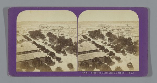 Curator: We’re looking at a striking photographic print by Jean Andrieu, titled "Gezicht op Hondarribia," placing it sometime between 1862 and 1876. Editor: Whoa, instant sepia flashback! The city perched on that little hill looks like it's levitating—some sort of ethereal cityscape caught in time. Curator: Indeed. The print adheres quite closely to principles within the realist style while exploring the conventions of landscape photography. Observe the foreground. Andrieu establishes a meticulous, spatial relationship using precise gradations. Editor: I see what you mean; he's built up these layered tiers leading up to the city. The monochrome tones are really working, and those hazy textures sort of swallow you into the view, as if it's a real-time mirage, slightly surreal, considering we know what we're seeing has probably since changed. Curator: The medium itself—photography at this stage—conveys that feeling. What may look romantic to the contemporary viewer underscores Andrieu’s use of sharp tonal contrast as part of photography's inherent documentary potential during this era. Consider the steeple reaching into the sky... it becomes a central point of reference that ties this community to some intangible presence, a higher power. Editor: Well said! You know, looking closer, it makes me think about my grandmother's old photographs; they all had this ghostly quality and captured such ordinary yet somehow poetic scenes. I'm strangely comforted, as if I were transported there. Curator: Nostalgia plays a significant role in our readings, yet that also informs a renewed sense of that community as seen by Andrieu in the original print, how this photographer attempted to offer the viewer both clarity and affect in looking at this subject. Editor: Okay, yes, the nostalgic pull is strong here, and what’s wild is, it creates its own echo long after the image was taken. That initial experience morphs and grows. Thanks for peeling the layers back on this old scene. Curator: My pleasure. The photograph reminds us that capturing space and time continues to inspire reflection across history and our contemporary present.
