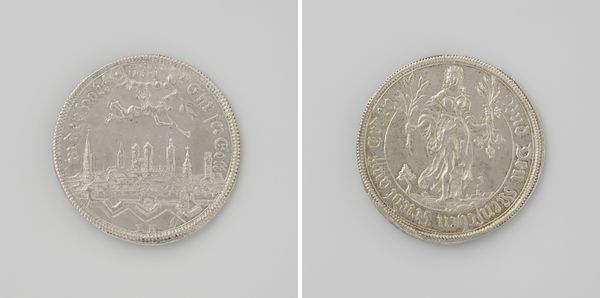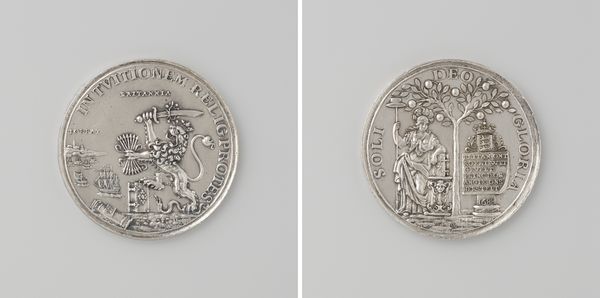Editor: Here we have Jacob van Dishoecke’s "Peace of Nijmegen," crafted in 1678 from silver. It’s a Baroque relief presented as a coin or medallion. There are a number of figures and symbols...I find it very formal. What do you see in this piece, especially considering its historical context? Curator: This medallion encapsulates more than just the signing of a treaty; it speaks volumes about power dynamics, gendered allegories, and the construction of historical narratives. The female figures, allegories of peace, justice, and perhaps liberty, are positioned as central to the achievement of peace. Consider who is absent: where are the warring kings and generals? Who gets to claim responsibility for peace, and what does that say about 17th-century society? Editor: So you’re saying the imagery is less about historical accuracy and more about…promoting a particular viewpoint? Curator: Exactly. It invites us to critically examine whose stories are being told and whose are being erased or recast. The cityscapes and royal insignia on the reverse further emphasize the intended audience and the solidification of power through the ‘gift’ of peace. How does that reading affect your understanding of this object, as a symbol? Editor: It’s almost like propaganda, framing the rulers as benevolent peacemakers. The contrast between the idealized figures and the reality of war is really striking. I didn't think about the absence of those actually warring! Curator: It is in fact propaganda! Understanding art objects like these necessitates engaging with not just the aesthetic but the deeply entrenched socio-political narratives they propagate. It urges us to question these constructed realities. Editor: I see now how deeply intertwined art is with power and social commentary. It makes you consider everything with a more critical eye. Curator: Precisely. Every brushstroke, every cast, carries a message that history books sometimes overlook.
