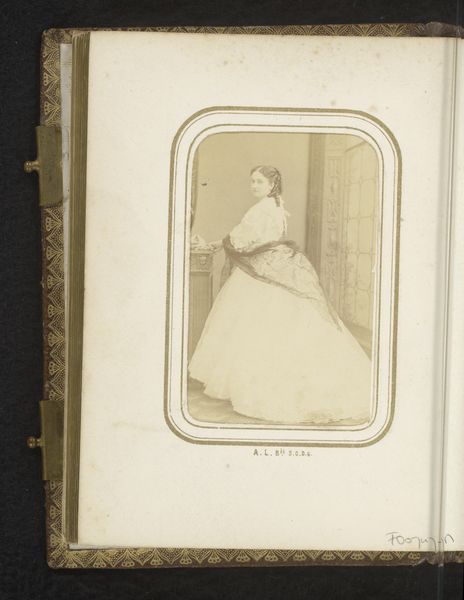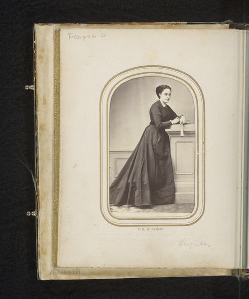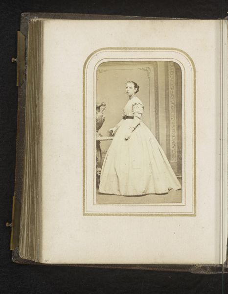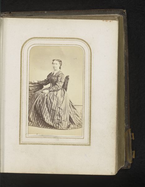 This photograph, "Portret van een zittende vrouw met hoed in de hand" by Yerbury & Stewart, presents a seated woman framed within a deliberately composed space. The muted tones and the woman's somber dress create a study in contrasts. Her posture and placement within the frame lend a sense of formality, yet there's also an underlying tension between the subject and the trappings of bourgeois portraiture. Consider how the artist employs compositional elements to convey status but also perhaps hints at the constructed nature of identity. The column, the curtain, and the patterned floor act as signs, each contributing to the narrative. Here, the photograph challenges the traditional portrait form, inviting us to consider not just who is represented but how representation itself functions as a cultural construct.