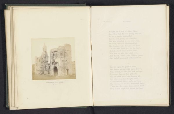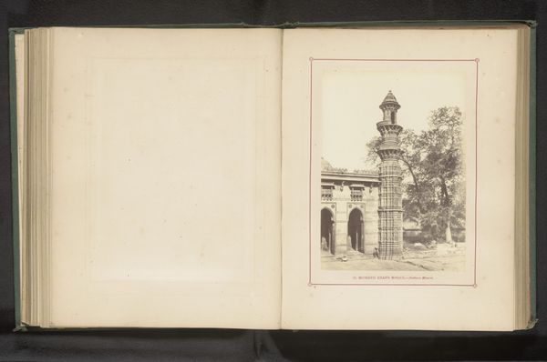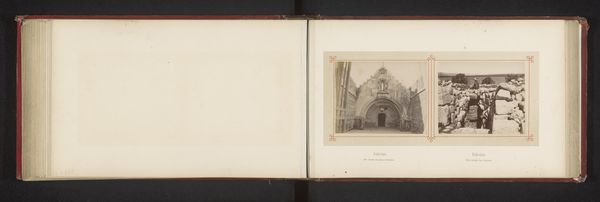 Curator: What a wonderfully preserved artifact. This is a page, likely from 1878, showcasing Vilhelm Dahlerup's Danish-style facade exhibited at the Paris World Fair. It appears to be a photographic print within a bound volume. Editor: My immediate response is drawn to the meticulous detail captured. The play of light and shadow across the architectural elements gives it a compelling sense of depth and solidity. The sepia tone adds an additional layer of warmth and historic depth. Curator: Absolutely. Dahlerup's design spoke to a particular moment in Danish national identity, eager to project a sense of cultural distinctiveness on a global stage. The fair itself was, of course, a site of complex power dynamics and colonial exhibition. It would be fascinating to consider the other national displays alongside this Danish facade, teasing out narratives of self-representation. Editor: It is the geometric arrangement of the facade itself that attracts my eye. The repetition of rectangular forms, the carefully balanced asymmetry, and the contrasting textures create a very harmonious whole. The embellishments never detract from the underlying form, only serve to enhance the visual experience. The classical type on the opposite page also forms a dialogue between architecture and literature in how the script reflects some of the geometric harmony as the print on the adjacent page. Curator: The use of a historicising architectural style itself is a deliberate act of cultural positioning. Dahlerup wasn't merely designing a facade, but evoking a lineage, constructing a visual argument about Danish history and its place in Europe, or even in the world order in general through cultural aesthetics. And in some ways that cultural order, while evoking beauty and refinement, played a role in rationalizing other non-Eurocentric societies as barbaric in comparison. The use of classical fonts and typefaces adds to that dialogue between beauty and its instrumental use as part of colonialism. Editor: And yet, isn’t there also a pure visual delight to be found here, a sense of aesthetic order that transcends its immediate political context? Perhaps this composition suggests how beauty, form, and line interact as elements of design as understood within Dahlerup's time? Curator: Perhaps. It's about holding both perspectives, understanding the visual power while interrogating its cultural work in the world. Editor: Indeed, the enduring allure of this Danish facade and its print perhaps resides in that complex interplay.