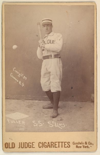 Editor: Here we have "James Edward 'Tip' O'Neill, Left Field, St. Louis Browns," a baseball card print from 1889. It’s pretty striking how the sepia tone and composition create this sense of timelessness, despite its age. What do you make of this piece from a formal perspective? Curator: The enduring quality, as you astutely observed, likely stems from the meticulous arrangement of elements. Consider the subtle gradations of tone across the image, establishing depth even within its monochromatic palette. The figure itself, almost centrally located, is skillfully rendered. Observe the slightly tilted bat that subtly interlocks with the verticality of O’Neill’s figure. It echoes, doesn't it, the format's verticality, leading our eyes deliberately through the picture plane. Do you perceive any tension between the figure and the text below? Editor: I do! Now that you mention it, the stark block lettering of "OLD JUDGE CIGARETTE FACTORY" clashes somewhat with the otherwise softer focus and more romantic feel of O'Neill's portrait above. Almost like two separate images sharing a single plane. Curator: Precisely. Semiotically, the lettering works, providing both context and commerce. It serves to ground the baseball player to the earthiness of daily life and its commerce, but does that relationship distract or amplify? Think of the relationship in terms of figure and ground and how this changes our focus in decoding the meaning of the portrait? Editor: It’s an interesting tension. While the ad aspect dates it, it also gives context. I see the formal components interacting with each other, each fighting for their place on the card. It makes you question the role of each part. Curator: An excellent observation. I have changed my reading. It appears it is not an advertisement first, but rather a moment caught in time. Editor: Thank you for illuminating these crucial details. It has encouraged a deeper appreciation!