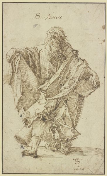 Curator: A decidedly unfussy portrayal, wouldn’t you say? What immediately strikes you about this unnamed sketch from the 17th century? Editor: There’s an almost…casual intimacy to it. Despite being just pencil and watercolour on toned paper, there's a vibrancy—the figure seems caught mid-moment, drinking from that hefty jug with genuine gusto. A very unidealized presentation of rural life I presume? Curator: The immediacy certainly transcends the medium. Observe the composition; the cross-hatching adds depth without obscuring the quick, confident lines that define the figure. Semiotically speaking, the slightly tilted jug hints at abundance, possibly referencing the bounty of labor but one might add a touch of overindulgence. Editor: That feels appropriate, I suspect such renderings of peasantry were not widely revered in their time? I wonder about its potential role within the art world of that era. Perhaps part of a larger, moralizing narrative, cautionary in nature? Curator: The identity of the artist remains a mystery, making historical positioning speculative. This unknown origin also contributes to the sketch’s charm. There's an almost rebellious subversion, contrasting it against academic rigidity and classical allusion. Editor: It does suggest that it was an exercise or personal piece. Notice the material properties: the soft gradations achieved with watercolor complement the toned paper, lending the sketch an antique quality even before age. The play of light and shadow focuses our attention on his face. Is it content, exhausted or inebriated, I cannot confidently say! Curator: I agree, although its precise function in history remains opaque, its formal properties invite ongoing evaluation. Editor: Indeed! What began as a quick draught has certainly proved engaging beyond what the artist may have first believed.