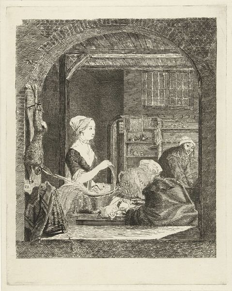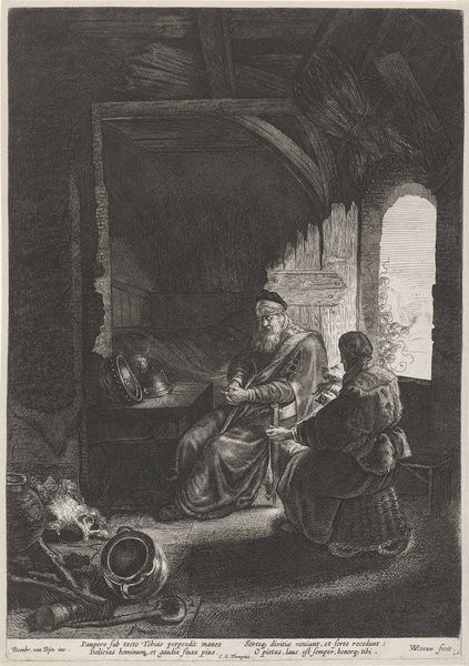 Editor: So, here we have Moses ter Borch’s "Tobit en Anna," a pencil drawing from 1661, held at the Rijksmuseum. I'm struck by the domesticity, but also this incredible feeling of stillness... almost like holding your breath in a quiet room. What resonates with you when you look at it? Curator: It's the quiet intimacy, isn’t it? Ter Borch captures this aged couple not in grand action, but in a moment of shared space, shared silence. Notice the window—it's almost a character itself, framing the scene, but also a kind of porthole. What do you suppose they're thinking? Are they reliving some moment of their history together? Editor: The light really draws the eye. It's interesting that you call it a porthole. It does add to the dreamlike state. What do you think of their expressions, or lack thereof? Curator: Exactly, a dream where clarity isn’t quite necessary. Their faces, softly rendered, hold a wealth of unspoken narrative. You see it in the gentle tilt of Tobit's head, perhaps a sign of listening, of considering something Anna has said. Maybe they are contemplating what they'll have for dinner, I like that human connection. And what is she doing? Does that seem to be wool spinning? Editor: Yes! You know, I was so caught up in the stillness, I didn't fully notice the spinning. That definitely brings the whole image back down to earth somehow. I really get the sense that, beyond any grand narrative, he’s captured something wonderfully… ordinary, yet profound. Curator: It’s a powerful statement. Sometimes the grandest stories are found in the hushed corners of ordinary lives. Perhaps ter Borch is nudging us to find the beauty in the mundane. Editor: I love that thought! Seeing the profound in the ordinary – definitely something I’ll carry with me. Curator: Absolutely, art whispers when you take the time to listen.