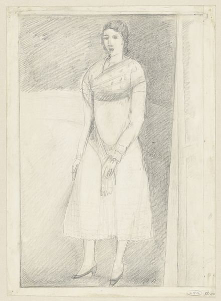 Otto Scholderer rendered this drawing of a standing woman with a fan using graphite on paper, an exercise in the interplay of light and shadow. The composition's simplicity draws us to the delicate, tentative lines which suggest form without fully defining it. Scholderer's marks articulate the woman's figure, her dress, and the fan, each rendered with an economy of detail that invites the viewer's imagination. There is a sense of provisionality, as if the drawing captures a fleeting impression rather than a definitive statement. Here, the structure is built through suggestion, allowing light to interact with form in an ethereal manner. The lack of precise contours challenges the conventional representation of form, and engages with semiotics, where meaning arises not from what is present but from what is absent or implied. By destabilizing fixed representation, Scholderer encourages a dynamic relationship between the viewer and the artwork, a collaboration in constructing meaning.