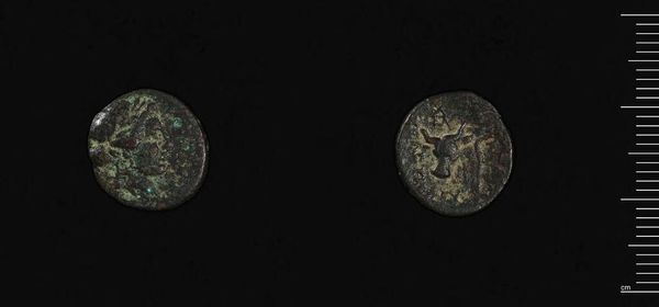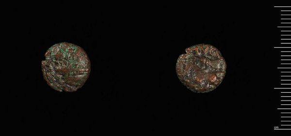 Curator: Today we're looking at a coin of Alexander the Great, likely from a Macedonian mint. Editor: It looks so tiny, like a lost button. And burdened with history, somehow. Curator: Its diminutive size belies its power, really. It would have been used as currency throughout his vast empire. The material itself—bronze—speaks volumes about trade and economics. Editor: I'm mostly struck by the patina. It's like a little abstract painting on metal, a story etched by time. You almost forget it's a portrait. Curator: Indeed, the wear and tear soften the imagery, but you can still make out the heroic profile, the lion skin headdress perhaps referencing Heracles. Editor: What a fascinating relic – so small, yet it contains echoes of immense ambition. Curator: Yes, holding it is like holding a whisper from antiquity.