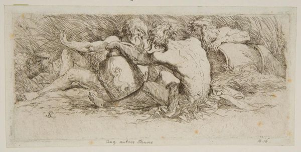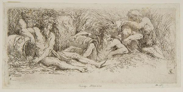Curator: Salvator Rosa’s "Five River Gods" presents a fascinating study in sanguine ink. The loose hatching lends the scene a hazy, dreamlike quality. Editor: It evokes such a somber, almost exhausted mood, doesn’t it? They seem weighed down, perhaps by the very waters they embody. Curator: The composition is intriguing—the figures arranged almost frieze-like, yet dissolving into the surrounding foliage. The strategic use of line weight creates depth. Editor: This could be read as a commentary on humanity's relationship with nature during the Baroque period. The languid poses, could they symbolize a loss of power, or perhaps, a merging with the natural world? Curator: Precisely. Rosa masterfully uses line and form to convey the textures—the rough bark, the flowing water, the musculature of the gods. It’s all meticulously rendered. Editor: It's a reminder that even mythical figures are bound to the earth, subject to the same limitations. Curator: Indeed, an observation of the formal elements reveals a delicate balance, yet the socio-political context enriches our understanding. Editor: It's fascinating how Rosa intertwines the classical with the contemporary concerns of his time.