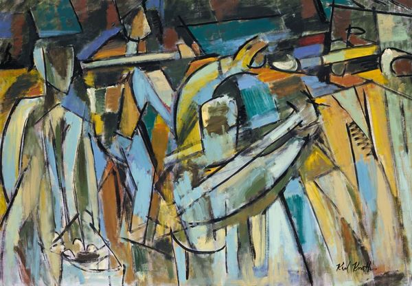 Curator: Looking at Antonio Corpora's 1952 painting "Alba/Dawn," executed in oil paint, one can immediately sense a chaotic energy that somehow resolves itself into a harmonious whole. Editor: It definitely strikes me as a bit jarring at first. So many intersecting lines! There's a sense of conflict, perhaps. It feels very anxious, as if something is about to break apart. Is it really trying to portray dawn? Curator: Well, remember this piece comes out of the abstract expressionist movement. Consider how artists like Corpora navigated the post-war period, grappling with new forms of artistic language and grappling with the socio-political issues of their time. He, along with artists worldwide, struggled to find adequate modes of expression, and sought to convey meaning by liberating the artwork from recognizable references. It wasn't merely an aesthetic choice; it was deeply connected to existential and political unrest. Editor: I hear that. But with all these geometric forms floating amidst the pale yellow, I keep searching for a grounding point. Perhaps, in the socio-political reading of it, it embodies the disorientation felt when old ideologies give way and are replaced by new uncertainties? Curator: Precisely! You can look at his dynamic composition, the very act of painting itself, as a reaction to what he observed about the world at that time. The fractured lines might represent shattered social structures or a world in conflict. The abstract composition allows him to capture a feeling, rather than depicting an easy scene or symbol. Editor: And the colors…mostly yellow, some greens, a bit of violet...there's a fragile light battling through, and despite all the angularity, it evokes a sense of hope breaking through. Is that intended to redeem the earlier sense of crisis? Curator: I appreciate you interpreting that way! Whether consciously or not, artists embed social contexts into their work, making them resonant with us even decades later. It showcases a deep human desire to not give in to conflict, that the breaking dawn implies renewal and promise. Editor: This has really challenged me to see the painting beyond just its initial appearance. I initially focused only on how I felt, which was pretty conflicted, and it never dawned on me how deeply embedded art can be with these post-war sentiments, these yearnings for resolution in social and political climates that are often in deep turmoil. Curator: It's in considering its history that its nuances and meaning emerge. Examining this context transforms how we appreciate Corpora’s work.