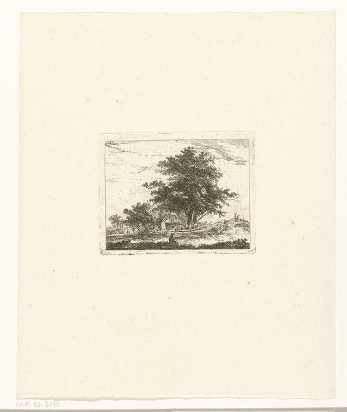 Curator: Before us, we have Willem Jan van den Berghe's etching, "Heuvellandschap met beek en brug waarop man met vee loopt," placing its creation sometime between 1833 and 1901. Editor: The overwhelming feeling it evokes is solitude. Despite the tiny figure walking the bridge, the density of the etched lines traps the viewer, almost like a dream, and imbues it with an incredible stillness. Curator: Yes, and within that feeling of solitude is perhaps an assertion of nature’s power. This print captures a pivotal moment when artists across Europe were attempting to understand their changing place in society, specifically, moving from rural lives to burgeoning urban centers. The man with the cattle reinforces this sense of change. Editor: The contrast almost turns to pure abstraction. There's a very modern push-pull between representation and flat pattern. Curator: Indeed. And even the choice of etching speaks to something. Etchings, because they are printed and reproduced, have a democratic impulse built into them. Editor: You can almost feel van den Berghe testing the limits of the etching medium, its capacity to generate atmosphere, the contrast he generates in such a small area... Curator: Exactly. The work suggests that rurality itself, this quiet pastoral scene, can be distributed. That is, one does not need to have a landed estate to enjoy it, or to be impacted by its values. One can possess a print. It's incredibly powerful when you realize the accessibility it offered at that time. Editor: I find myself drawn to how such precise work yields such an expressive effect. Its technical execution becomes part of its aura. It invites slow looking and it is interesting how an image so small manages to feel expansive. Curator: The landscape, democratized through the etching process, speaks volumes about 19th-century shifts in societal access. Editor: Agreed. Ultimately, Van den Berghe’s choices grant a real intimacy, a concentrated emotional punch in a relatively diminutive space.