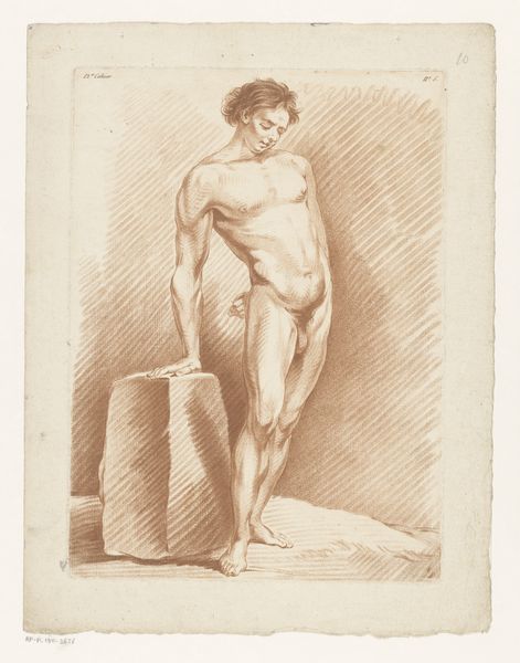 This is an anonymous drawing of a seated nude male model on a low plinth with a cushion. It belongs to a long history of representing the male nude in Western art. Historically, such drawings were often exercises for artists to study anatomy and idealize the male form, yet this work seems to capture a more vulnerable and human figure. The model's gaze, averted and somewhat melancholic, invites a different kind of engagement. The drawing defies traditional notions of masculinity. It offers a tender, almost intimate portrayal. This challenges the typically heroic or idealized depictions of men, presenting instead a figure that is pensive, perhaps even troubled. It's in this tension between classical form and emotional vulnerability that the drawing finds its power, prompting us to consider the diverse ways of representing masculinity.
