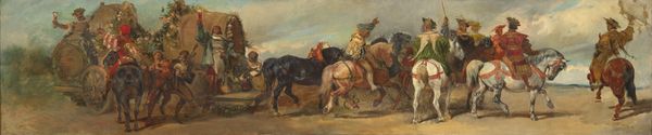Horace Vernet created this oil painting depicting two soldiers on horseback sometime in the first half of the 19th century. Vernet came from a family of painters and he specialized in military subjects. This image represents a specific kind of militarism that came about as a result of the French Revolution and the Napoleonic Empire. It reflects the shift away from the formalism of the old Royal Academy in France, and towards a populist Romanticism that glorified military heroes and intense action. The image participates in a cult of the military hero that emerged after Napoleon's rise to power, and that continued even after the restoration of the French monarchy. Historical research into the French military archives and popular illustrated magazines of the time can help us understand the nature and effects of the new kind of military spectacle in French society and culture. These sources also reveal how official institutions shaped the production and reception of art, defining the public role of art and the politics of imagery.
