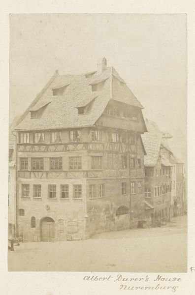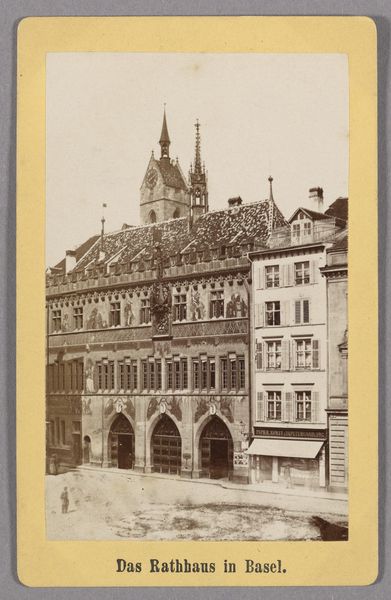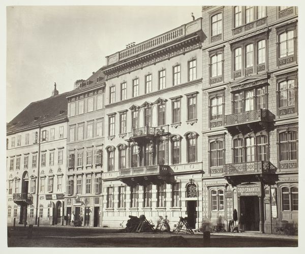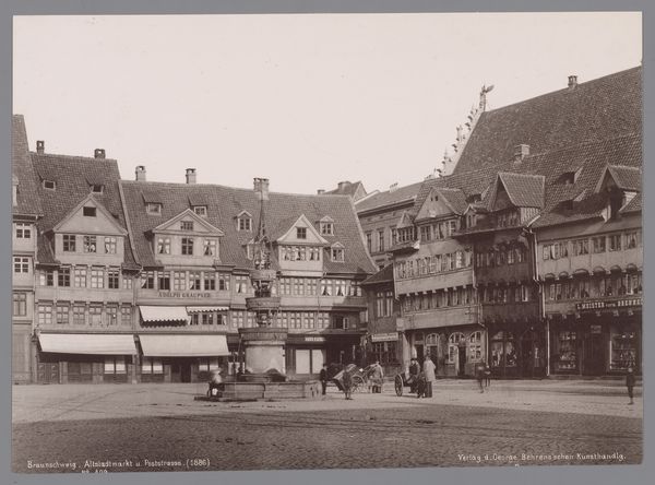 Curator: This image captures "Huizen in Innsbruck met rechts het balkon van het Goldenes Dachl-huis," a photograph from 1900, currently held in the Rijksmuseum collection. Editor: Oh, it's so evocative, almost like stepping back in time. I'm immediately drawn to that golden balcony—it practically shimmers, even in this monochrome print. It seems to anchor the whole scene. Curator: Yes, the Goldenes Dachl, or Golden Roof, is the focal point here, drawing the eye with its ornate, gilded tiles. It served as a symbol of power and prestige for Maximilian I in the late 15th and early 16th centuries. But it also represents a connection to the past. Editor: It's amazing how a building can be a symbol, isn't it? But, you know, apart from that glittering balcony, I find this cityscape almost…melancholy? There's a weight to those solid structures, maybe heightened by the sepia tones, almost like nostalgia for something that can never be. Curator: Photography at the turn of the century had that quality, often seen through a nostalgic lens. The rigid structures of the buildings stand in contrast with the everyday activity at street level, reminding the viewer that daily life occurs regardless of significant structures or historical relevance. Editor: Exactly! It is so nice to see these common folk occupying and using space overshadowed by the importance of buildings. In an odd way, that tension feels relevant to modern anxieties. We all navigate and function in places of enormous historic relevance on a day to day basis, right? Curator: I see your point. The presence of those people is a reminder of their continuous activity, as the balcony and architecture are merely backdrops. I think this perspective provides an anchor for interpreting these historical settings by imbuing a narrative with which people from the present may find connection. Editor: Well, it's definitely given me a lot to think about. The tension of everyday life clashing with looming grandeur is a story as old as time! Curator: It does indeed offer a poignant reflection, I appreciate your fresh perspective on this enduring cityscape.