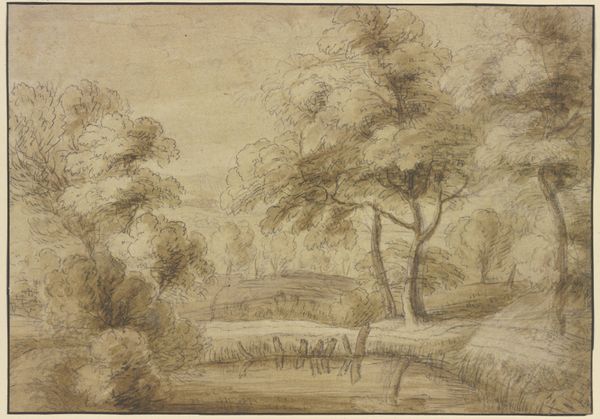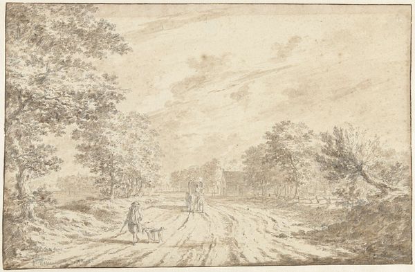 Abraham Furnerius created "Weg door het bos" using pen and brown ink, crafting a landscape scene. The drawing emphasizes the interplay between light and shadow, achieved through the varying densities of ink application. You can see how the artist built depth and volume in the foliage of the trees. Furnerius uses simple materials like ink and paper, but that doesn't mean the drawing isn't labor-intensive. Consider the skill required to manipulate the ink, building up textures and tones to create a realistic image. The artist must have spent hours observing and then translating the forest onto paper. "Weg door het bos" invites reflection on our relationship with the natural world. It prompts us to consider the labor and skill involved in artmaking, and challenges the notion that fine art is somehow separate from the craft of drawing.